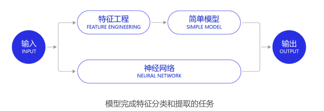 - 深度学习改变了很多领域算法的实现模式。在深度学习兴起之前,很多领域建模的思路是投入大量精力做特征工程,将专家对某个领域的“人工理解”沉淀成特征表达,然后使用简单模型完成任务(如分类或回归)。而在数据充足的情况下,深度学习模型可以实现端到端的学习,即不需要专门做特征工程,将原始的特征输入模型中,模型可如图所示,同时完成特征提取和分类任务。