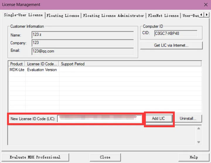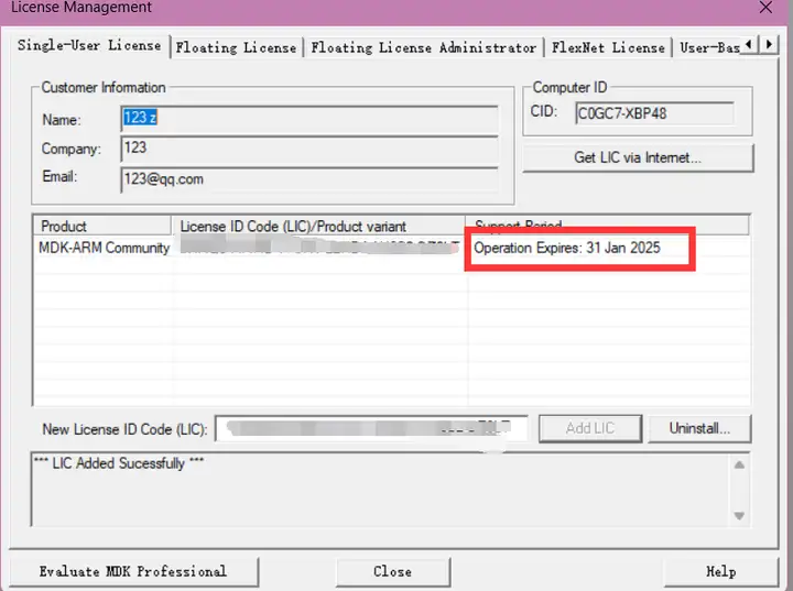将复制的License粘贴到Keil里面的New License ID Code(LIC)下,然后点击Add LIC,如图2-5-11所示。