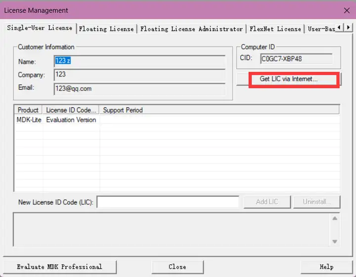 点击Get LIC via Internet按钮,如图2-5-3所示。