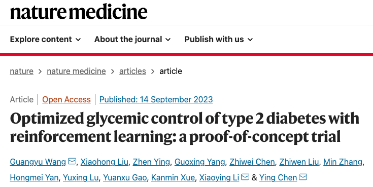 2023年9月14日,复旦大学附属中山医院李小英、陈颖团队联合北京邮电大学王光宇团队,在国际顶尖医学期刊 Nature Medicine 上发表了题为:Optimized glycemic control of type 2 diabetes with reinforcement learning: a proof-of-concept trial 的研究论文【4】。