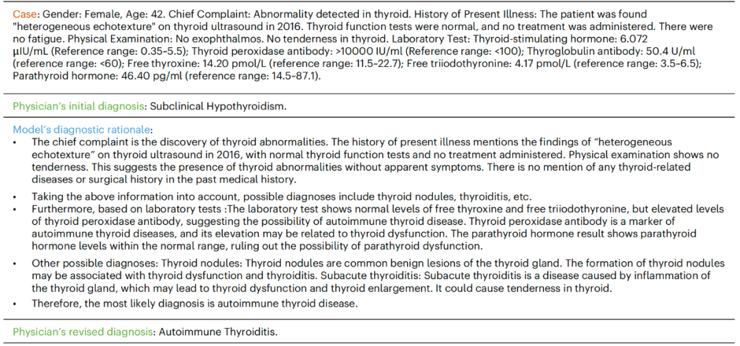 对于上述病情描述,医生诊断为亚临床甲状腺功能减退,而 MedFound 模型诊断为自身免疫性甲状腺疾病,医生将诊断结果修正为自身免疫性甲状腺炎。