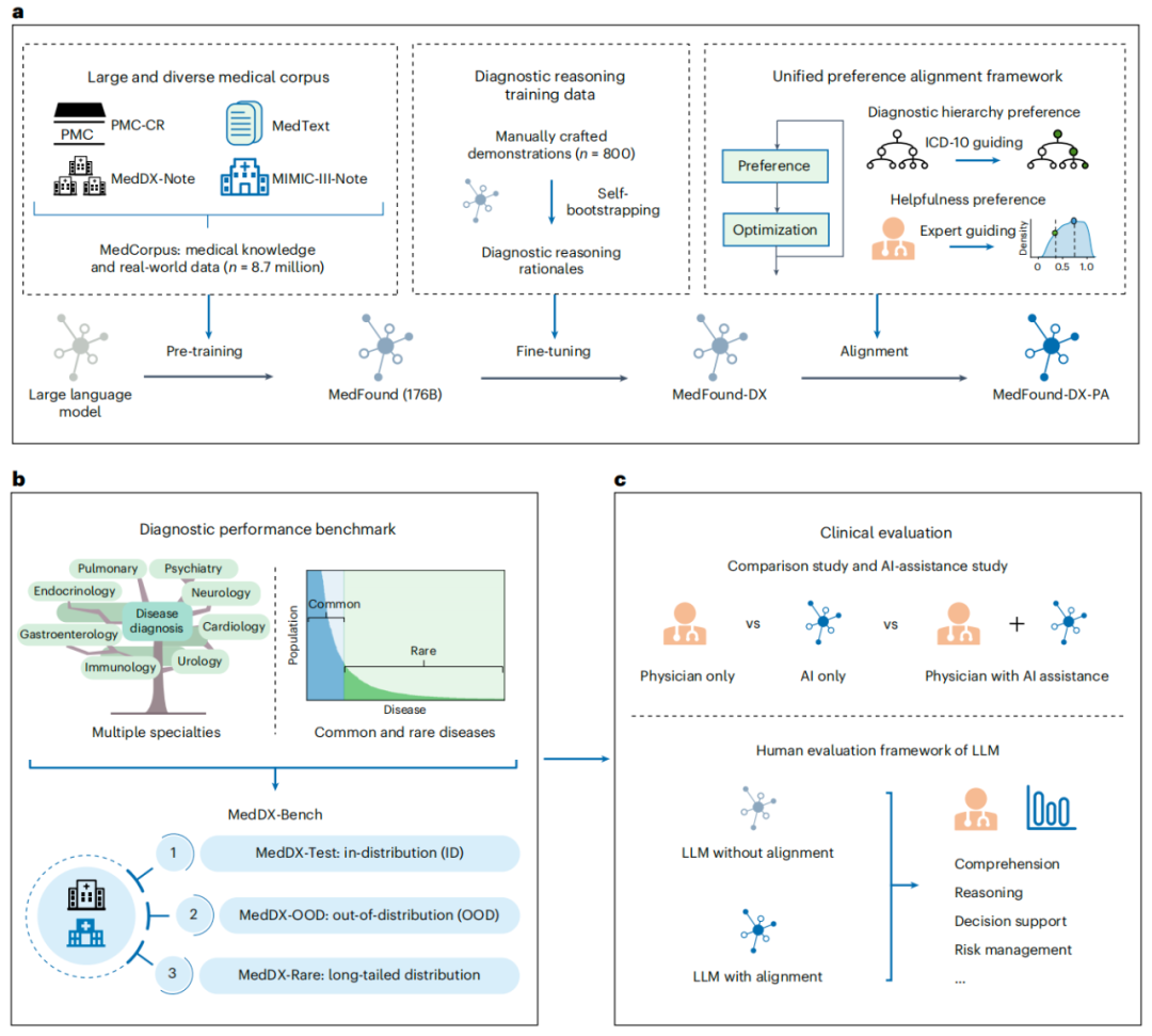 该研究开发了一种用于疾病诊断辅助的通用大语言模型——MedFound。