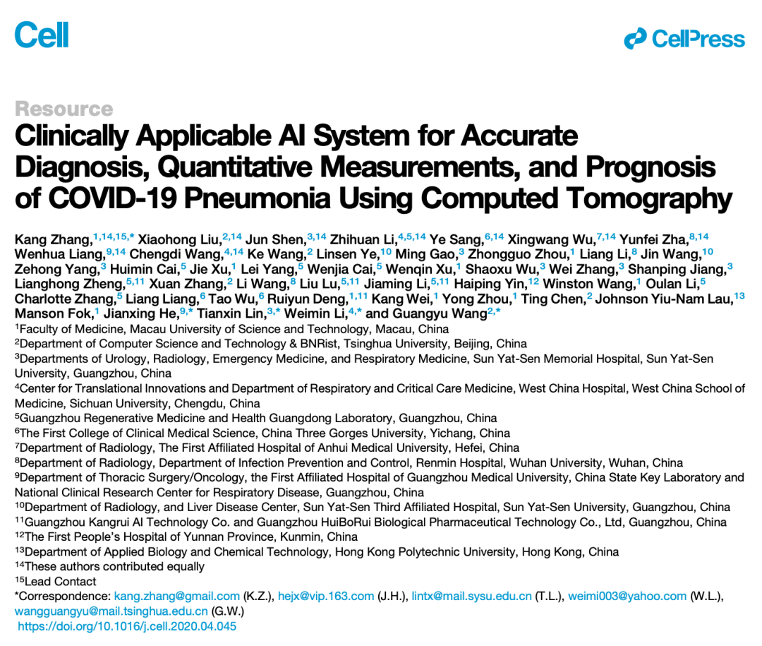 2020年4月,王光宇等人在国际顶尖学术期刊 Cell 发表论文【2】,该研究利用CT数据开发了一款人工智能(AI)系统,可用于诊断新冠肺炎,还能够将其与其他常见肺炎和正常对照区分开来,从而协助放射科医生和内科医生进行快速诊断,帮助临床医生对抗COVID-19。