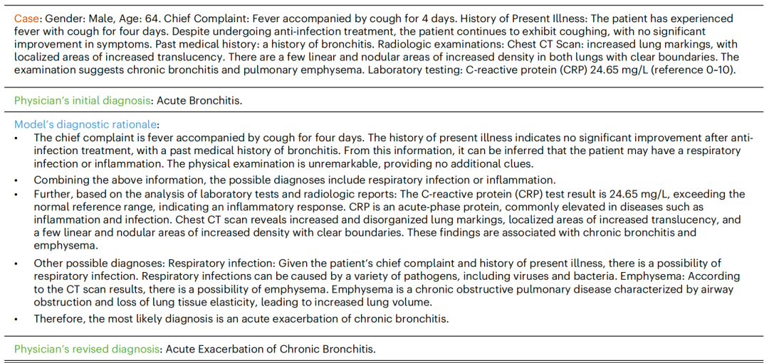 对于上述病情描述,医生诊断为急性支气管炎,而 MedFound 模型诊断为慢性支气管炎急性加重,医生将诊断结果修正为慢性支气管炎急性加重。