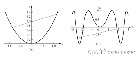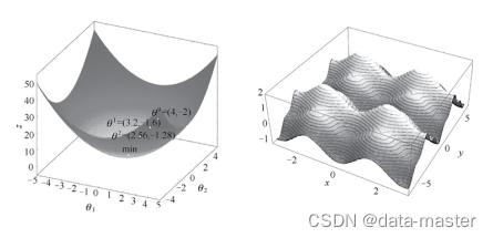 如果我们将一颗弹珠扔到曲面中,会出现不同的情况。当函数是凸函数时[(a)所示的凸曲面],无论弹珠起始位置在何处,弹珠最终都会落在曲面的最低点,而这个极小值恰好是全局最小值。当函数是非凸函数时[(b)所示的非凸曲面],弹珠仍然会落在曲面的某个低点,但这个极小值不能保证是全局最小值。