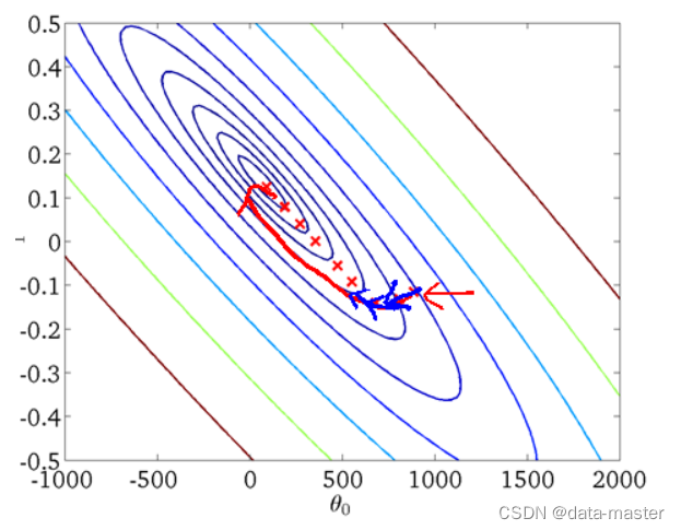 最后,确定迭代步长。下山的起始点知道了,下降的方向也知道了,还需要我们确定下降的步长。如果步长太大,虽然能够更快逼近山谷,但是也可能由于步子太大,踩不到谷底点,直接就跨过了山谷的谷底,从而造成来回振荡。如果步长太小,则延长了到达山谷的时间。所以,这需要做一下权衡和调试。(太短学的慢,太长容易跨过最优处)