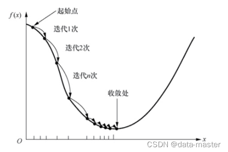 梯度下降法是一种逐步迭代、逐步缩减损失函数值,从而使损失函数值最小的方法。如果把损失函数的值看作一个山谷,我们刚开始站立的位置可能是在半山腰,甚至可能是在山顶。但是,只要我们往下不断迭代、不断前进,总可以到达山谷,也就是损失函数的最小值处。例如,假设一个高度近视的人在山的某个位置上(起始点),需要从山上走下来,也就是走到山的最低点。这个时候,他可以以当前位置点(起始点)为基准,寻找这个位置点附近最陡峭的地方,然后朝着山的高度下降的方向走,如此循环迭代,最后就可以到达山谷位置。