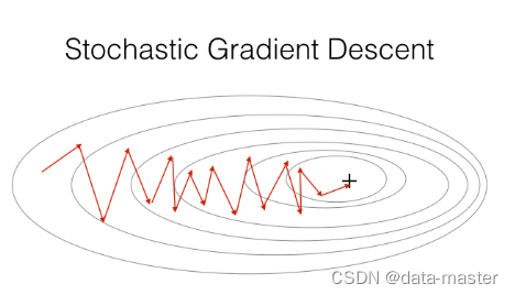如果我们的数据集很大,比如几亿条数据,我们的迭代次数(这个迭代的次数其实就是随机样本数,我们再说的通俗点,就是取的个数,每次迭代结束都有一个最优的解,在进行第二次迭代)基本上设置1,2,(10以内的就足够了)就可以。但是SGD也有缺点,因为每次只用一个样本来更新参数,会导致不稳定性大些(可以看下图(图片来自ng deep learning 课),每次更新的方向,不想batch gradient descent那样每次都朝着最优点的方向逼近,会在最优点附近震荡)。因为每次训练的都是随机的一个样本,会导致导致梯度的方向不会像BGD那样朝着最优点。