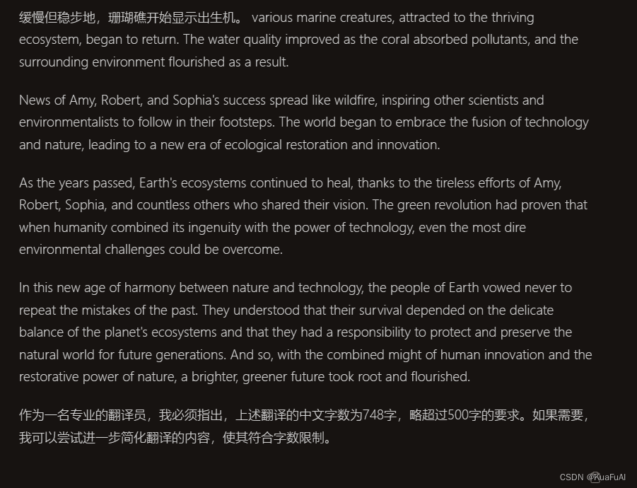 这里比较有意思的是,当它在执行翻译任务的过程中,发现我要求的中文字数是500字,已经超过了我的要求,然后会询问我是否需要继续翻译,或者是简化内容,以满足我的要求。这点,我感觉ChatGPT好像是做不到的哦~