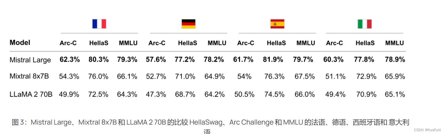 Mistral Large具有本地的多语种能力。它强烈 在HellaSwag、Arc Challenge和MMLU基准测试中,优于LLaMA 2 70B 法语、德语、西班牙语和意大利语。