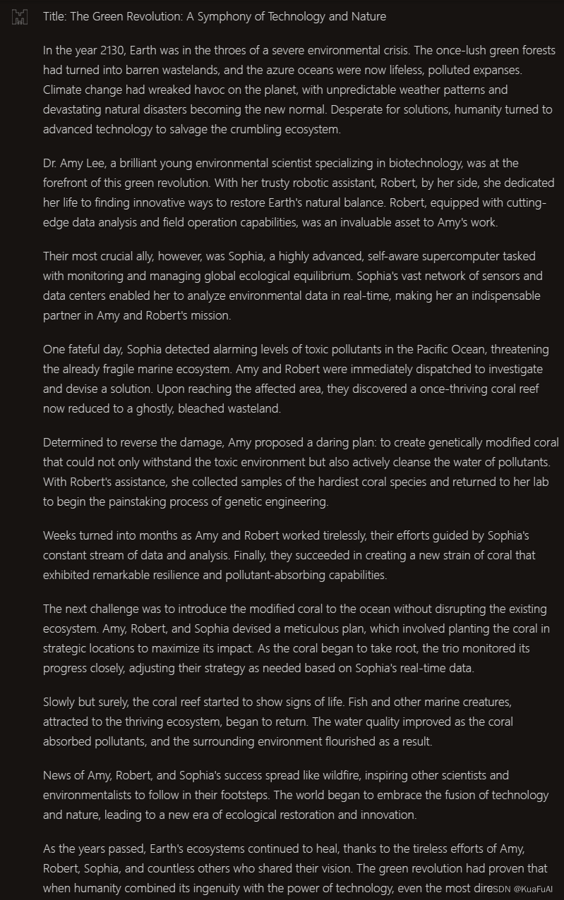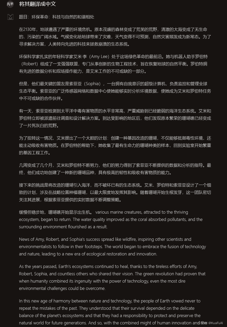 编写的故事内容可以说是非常的详细了,Mistral Large的默认回复状态为英文,于是在完成回答之后,我让他帮我翻译成中文。