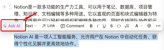 这里我想说说Notion ai,这是植入在Notion中的一款ai工具,使用Notion ai不需要魔法。