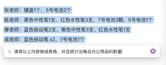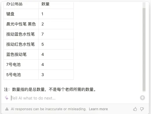 比如我需要统计办公室人员领取的办公用品时,每个人给我报了数量,这时我收到的是一堆非常零散的数据,不管我用Excel表格还是其他方法,我都要自己再算一次,统计出总数。而我使用Notion ai的话,我只需要把每个人需要的东西列上去,然后一键选择,通过“ask ai”,让它帮我计算出总数,整个过程几秒钟搞定了,非常方便快捷。