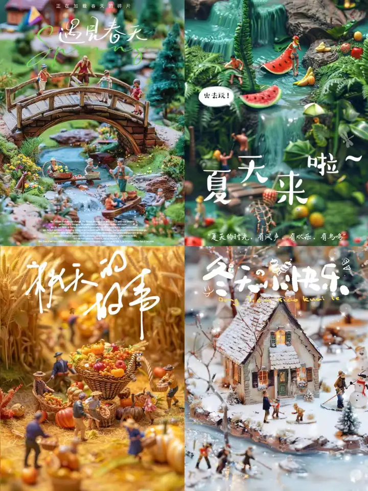 midjourney还可以做一些设计图或者插画,这是我自己做的一组四季微景观的海报图: