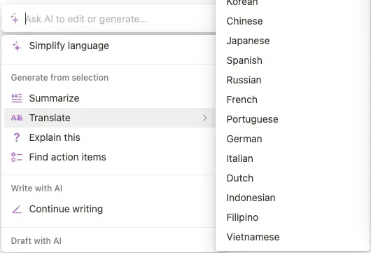 Notion ai可以进行总结、翻译、查找等,另外还可以用Notion ai对文档进行整理,提取需要做的事项,整理成Todo list的格式。它是一个很优秀的办公小助手,我平时会丢一堆“杂活”给它干。基于Notion强大的平台,这已经成为我日常工作离不开的助手之一了。