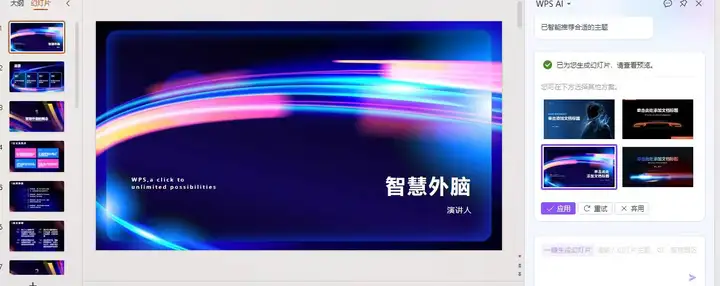 这是最新用的一款ai,植入在wps里,用它来做ppt特别快。平时每次做ppt,找模板、画表格之类的,都很头大啊,用完wps之后,只需要把大纲丢进去,然后把风格和要求说一下,坐等它设计,最后自己再根据内容稍微调整一下,妥妥搞定。效率不是一般地高。