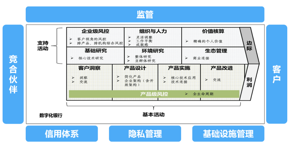 无障碍服务能力也是两份文件重点关注的内容,提供无障碍服务能力的手段不少,不过本文拟集中阐述的是视频银行,尤其是移动渠道的视频化。《银行数字化转型》中曾尝试定义过数字化银行的价值链,其图示如下: