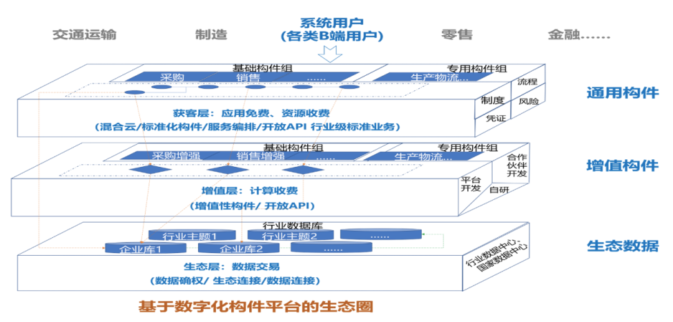 为了进一步帮助中小银行的架构设计能力提升,监管机构可以组织行业级的开源、开放,请企业架构建设的先行机构将粗粒度的架构资产、工艺推广为团标、行标,这样既可以方便中小型银行参照,又能屏蔽业务细节,保护商业秘密,也能响应国家标准化建设发展要求,提升行业的业务、产品标准化程度。国家也提出希望行业龙头企业联合软件企业共同设计行业通用软件,很多人也认为国家数字化转型带来了行业云、SaaS软件新的发展机遇,其实这样的机遇不仅是来自国家政策,也是技术发展的必然趋势,如今在国家政策的推动下,这个趋势可能会发展的更快了。《聚合架构:面向数字生态的构件化企业架构》一书中描绘的基于行业级标准化构建的数字化构件平台,就是这样的愿景: