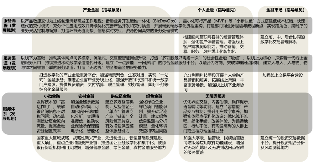 数字化最终要给客户带来更好的价值和体验,而客户最直接感受到的就是银行服务。“发展规划”提出“重塑智能高效的服务流程”,通过采用业务开发运维一体化(BizDevOps)、最小化可行产品(MVP)、仿真模拟、可用性测试、净推荐值(NPS)调研、机器人流程自动化(RPA)、自然语言处理(NLP)、智能字符识别(ICR)等技术重塑服务流程,“实现跨角色、跨时序的业务灵活定制与编排”;“搭建多元融通的服务渠道”,通过采用5G、增强现实(AR)、混合现实(MR)、应用程序接口(API)、物联网等技术“打造“无边界”的全渠道金融服务能力”;“打造数字绿色服务体系”,通过采用大数据、人工智能、移动物联网、卫星遥感、电子围栏、电子签章、远程音视频等技术“缓解银企间信息不对称问题”,“提高农村地区金融服务下沉度和渗透率”,“有效増强供应链金融整体服务能力”,“提升绿色金融风险管理能力”,这一部分是“发展规划”中出现技术种类最多、最密集的部分,也体现了对数字化银行的技术驾驭能力的要求,综合这些技术类型看,就算深层次的业务本质没有改变,数字化银行也堪称是一个“新物种”了。“指导意见”则是按照业务领域划分提出的要求,产业数字金融方面,“打造数字化的产业金融服务平台”,“加强开放银行接口和统一数字门户建设”,“推进函证业务数字化和集中化”;个人金融服务方面,“拓展线上渠道,丰富服务场景,加强线上线下业务协同”,对互联网客户群体、老龄和残障客户群体、无网点覆盖客户群体,分别提出了不同的服务要求,旨在“推动解决“数字鸿沟”问题”;金融市场交易业务方面,“加强线上交易平台建设”和“建立统一的投资交易数据平台”是重点任务。在数字服务部分,“发展规划”侧重从体系建设方面横向提出的要求,“指导意见”则侧重从业务领域方面纵向提出的要求,二者横纵交织恰好构成一个二维矩阵式的转型要求,如下图所示: