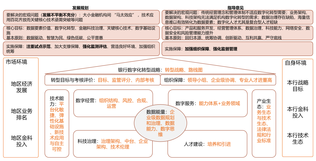 数字化转型不只是单个银行的一次经营模式、技术能力转型,而是全行业为适应数字经济发展要求进行的整体转型,这一点在两份指导文件的开篇都有明确提及, “发展规划”中指出,“数字经济的蓬勃兴起为金融创新发展构筑广阔舞台”,“数字经济浪潮已势不可挡”;“指导意见”中指出,“加快数字经济建设,全面推进银行业保险业数字化转型”,二者都将数字金融发展的目标指向对数字经济发展的支持,也同样都将金融科技定位在深化金融供给侧改革、更好服务实体经济、实现高质量增长的重要创新力量。这也印证了本文在前文中梳理的文件体系脉络中表现出的概念之间的关系,也即,数字化是最大的命题,其中包含数字经济,落实到金融行业,就是数字金融。