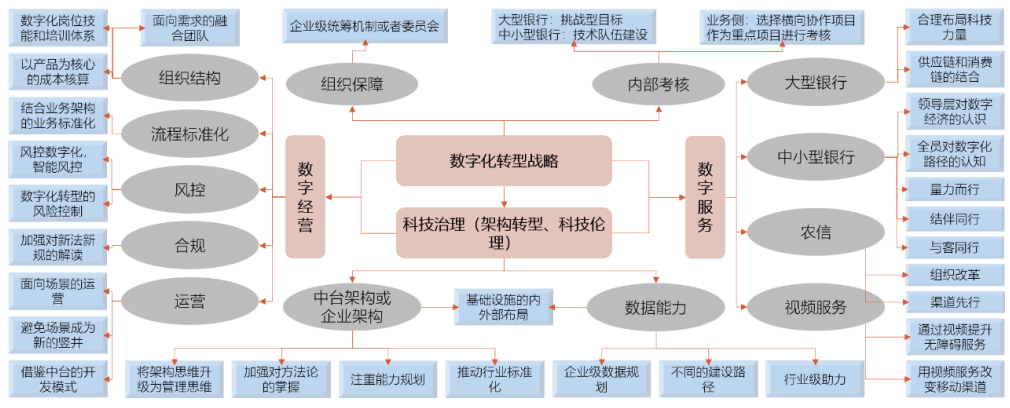 银行做数字化转型战略,一定要以充分研究国家政策为起点,因为这些政策推动的数字化会给人民的“生产生活带来广泛而深刻的影响”。在本文第一部分梳理的政策体系中,“纲要”、《“十四五”数字经济发展规划》、地方政府数字化转型政策、法律法规会共同构成银行数字化转型的外部框架,这些框架可以给银行战略制定提供边界和方向,尤其是对数字化转型尚觉“模糊”的中小银行,政策本身就是高度凝聚的智慧成果,是非常值得深入学习和研究的,而且一定要列入各级党委、党组织、所有党员的学习任务中,以发挥党员的模范作用。不清楚政策方向的转型,是盲目的,是不可取的。