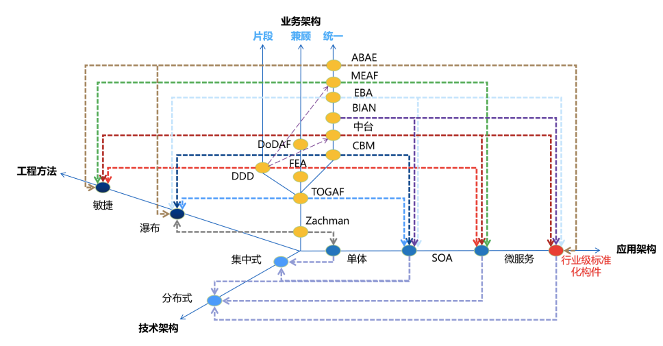 企业架构的确是一种有效的全局规划和落地执行方法,尽管看起来有些笨重,但实际上,这往往有些误解,它的“重”是源于工程规模的,不是所有的企业架构执行都会很“重”,比如,一些中小企业的数字化建设,也是在梳理全局业务的基础上,去对薄弱环节、业务痛点进行数字化改进,其实施也未必很重。那么企业架构有多少种呢?“发展规划”中提到的“中台架构”与“指导意见”中提到的“企业架构”是什么关系呢?《聚合架构:面向数字生态的构件化企业架构》一书把企业架构理论发展的沿革梳理了一张图,本文借鉴如下: