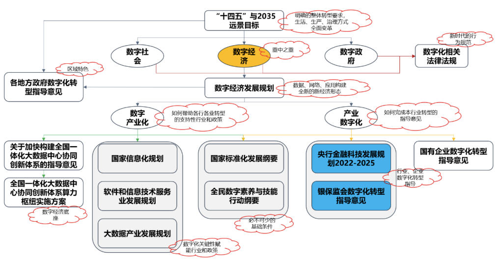 从“产业数字化”方向上看,国资委2020年9月出台的《关于加快推进国有企业数字化转型工作的通知》较早提出了对企业的数字化转型指导要求,并明确提出了 “以企业架构为核心构建现代化IT治理体系”,“探索构建适应企业业务特点和发展需求的“数据中台”“业务中台”等新型IT架构模式”等数字化转型方向。对银行业的数字化转型实操具有明确指导要求的两份文件也属于“产业数字化”这个方向,也需要在对整个文件体系的理解下进行解读。
