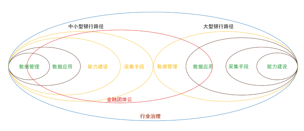 C、行业级助力。两份文件都有对弹性基础设施或者金融团体云等公共设施的建设指导,“发展规划”中还提到“上云用数赋智”,按照对绿色数据中心的发展要求,今后中小型银行维护独立数据中心的难度越来越大,采用金融团体云是较为合理的方向,而云本身就是资源和算力管理的基础设施,数据能力的发展也离不开这两项。从机构自身数据能力基础来看,大型银行对金融团体云的诉求和影响很可能集中在数据管理、数据应用上,也就是生态级数据标准和合规的跨机构数据应用;而中小型银行很可能数据能力整体上都与金融团体云相关,尤其是采集手段、能力建设这两项,数据应用中的服务设计也可能会在金融团体云上通过云原生的方式实现,数据管理中的数据标准、资产定义也会受到行业发展的影响。由此,依托金融云开展的行业治理可以为所有银行的数据能力提升带来不同方向上的共享的改善。