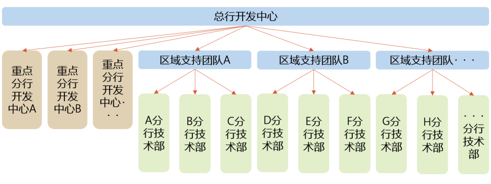 如果要增强基层对技术运用能力的拓展,就意味着全行技术团队需要有合适的布局,也就是总行与分行开发力量的配置问题。大型银行以集中开发模式居多,但是基于深度连接的业务也会具有一定的个性化特征,如何保持总分行间开发力量的合理布局,使面向大企业、行业大平台的需求和区域特色业务的开发都能得到适当的支持,是比较考验整体布局能力的,是否应该总行和分行都配置足够的开发力量,还是总行和跨分行的地区性服务团队相结合,这方面很难有定论,如果分行都配置足够力量,则开发能力过于分散;如果在总行之下再设置一层跨地区的开发机构,则管理和考核上又不好处置。本文认为,目前折中一些的配置方式是总行建立较大的集中式科技团队,选择重点地区的分行建立规模适当的科技团队,然后其他分行归总行团队支持,并在总行中设置分区域的支持团队,结构如下图所示: