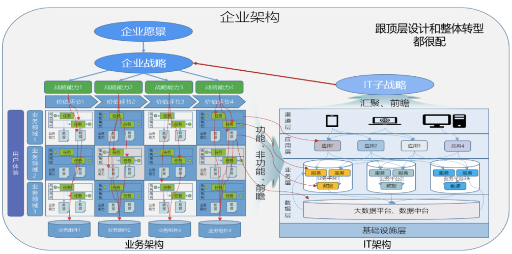 完整的企业架构设计包括企业级业务架构设计和由业务架构驱动的企业级IT架构设计。企业级业务架构设计包括对战略的分解,对企业级价值链的设计,基于业务领域和价值链进行的、融合用户体验的企业级业务横向整合设计,基于业务和数据的设计,提炼数字时代的“业务能力”,也就是通过一定的业务操作来处理一定的业务数据去实现业务目的的过程,这是一套面向数字时代的业务规划方法,也要求业务人员能够同时面向业务和数据进行业务能力分析,可以完成这个任务,那么业务人员的数字化能力转型也就完成了最关键的一项:设计数字化背景下的业务和产品。当然,这个过程不是业务人员独立完成的,是要由业务人员和技术人员共同进行的,这也是业务和技术深度融合最关键的环节:由二者共同深入分析业务,不是面向需求,而是面向业务变革。这一环节是建设“指导意见”中提到的“企业级业务平台”的基础,也是“发展规划”中提出的“业务中台”的建设基础。