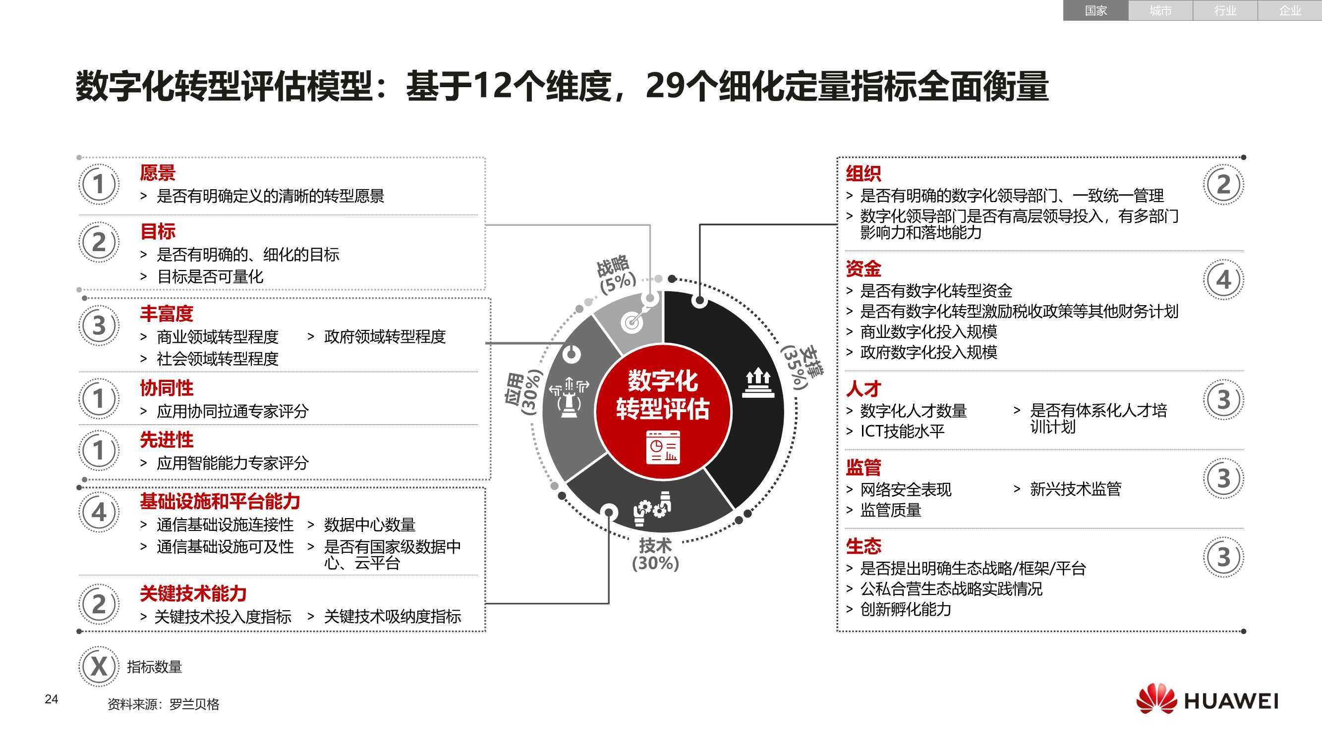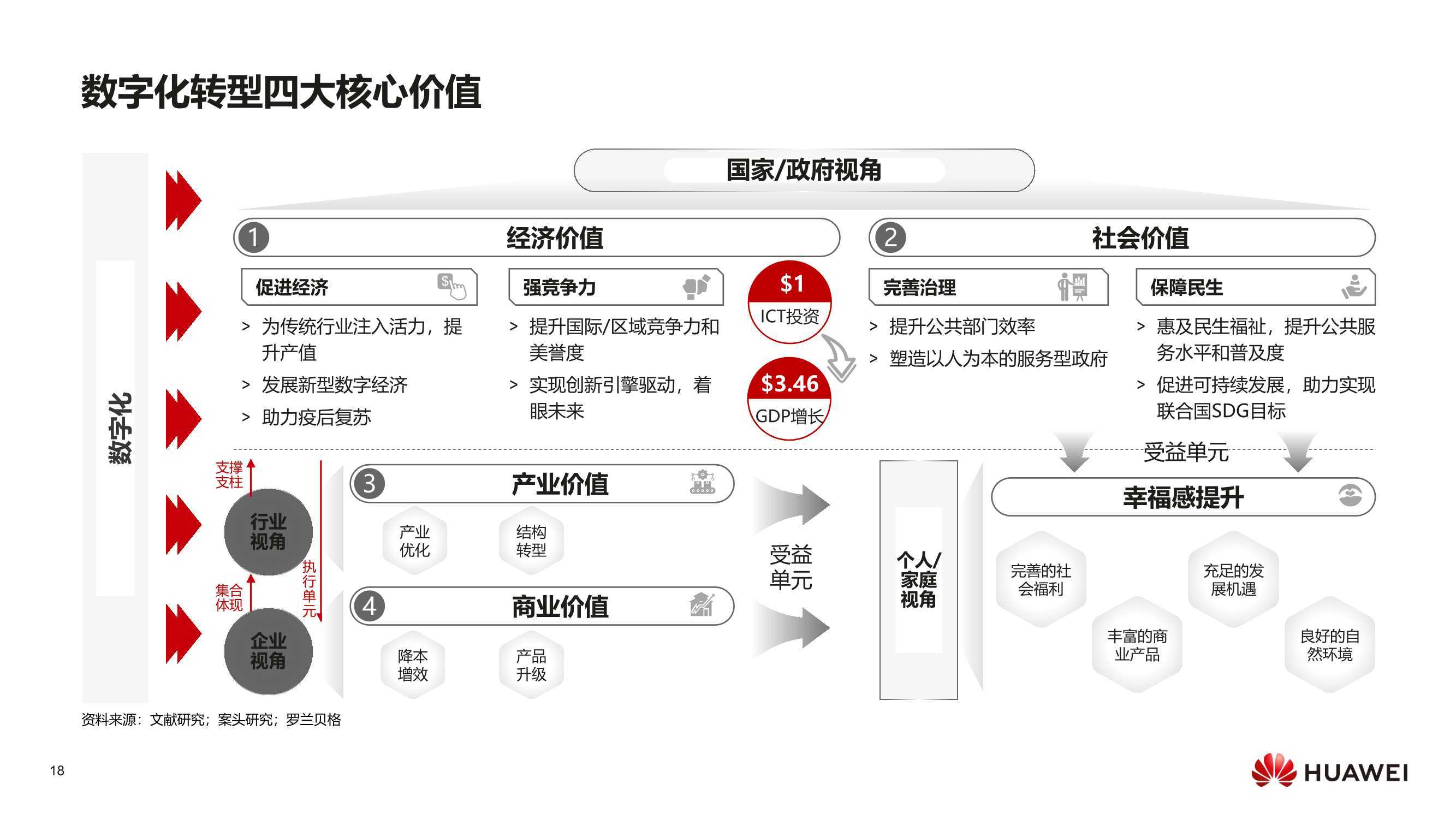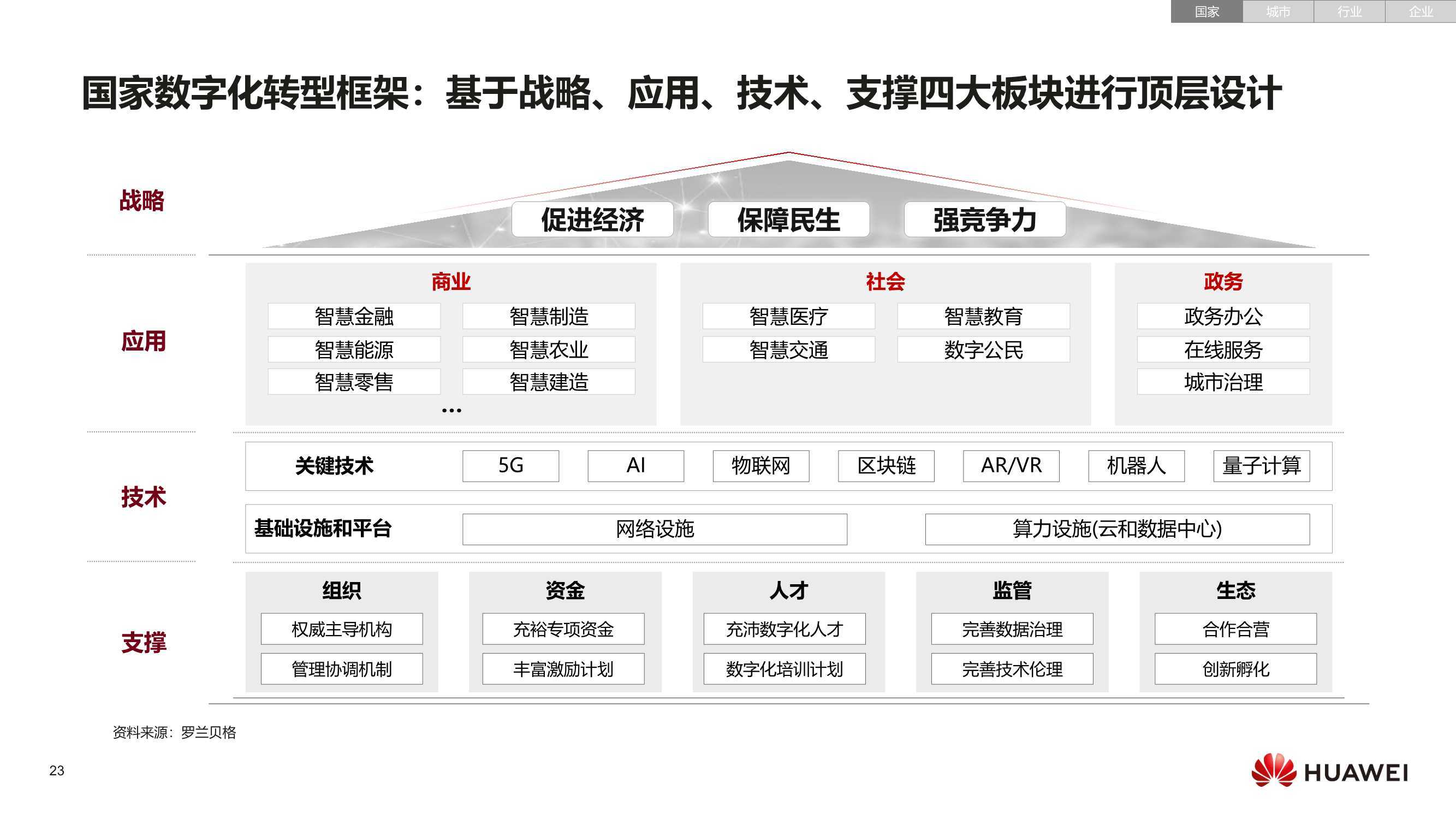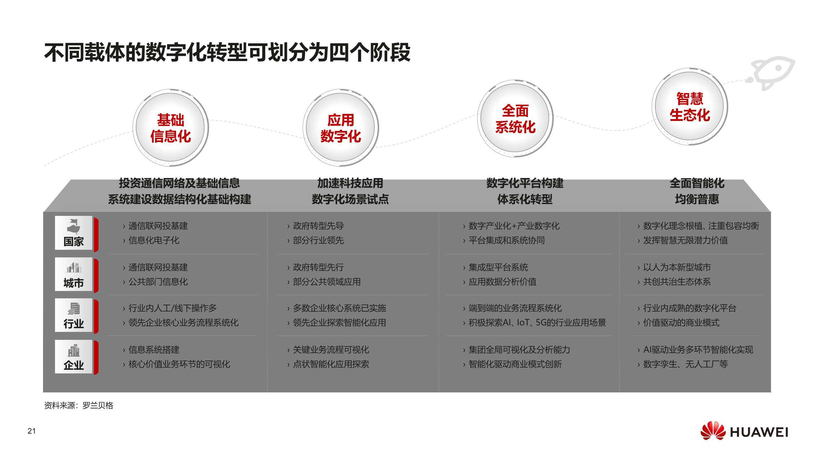 下面这份材料介绍了华为的数字化转型,从战略到执行,结合100多个国家的案例与数据,从6个角度(个人-家庭-企业-城市-行业-国家)、4个层次(国家-城市-行业-企业)、4个阶段(基础信息化-应用数字化-全面系统化-智慧生态化),系统解读数字化转型从战略到执行的全景框架,洞察实践,以及不同数字化转型阶段数字基础设施的部署重点及对数字经济的量化影响。