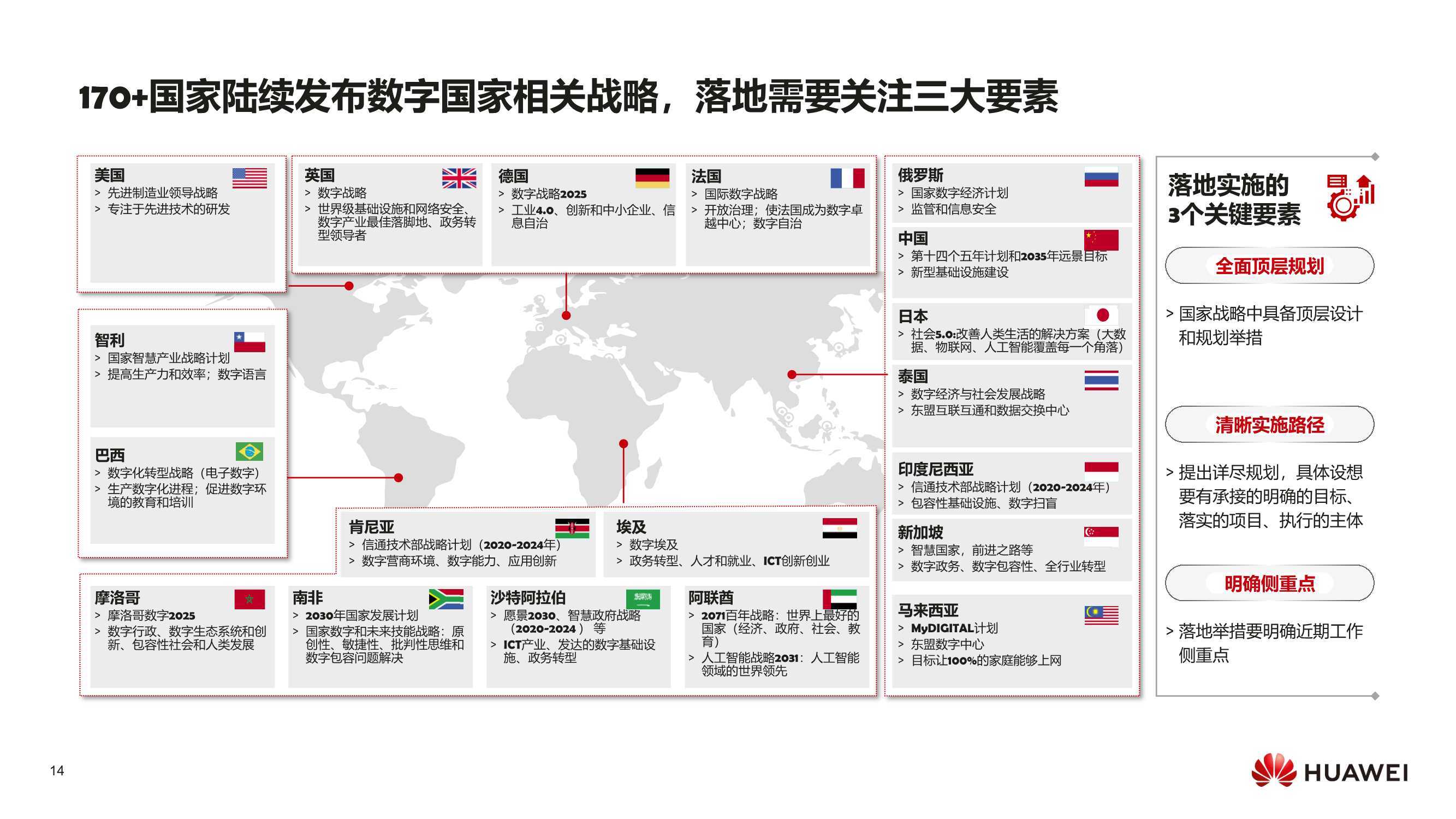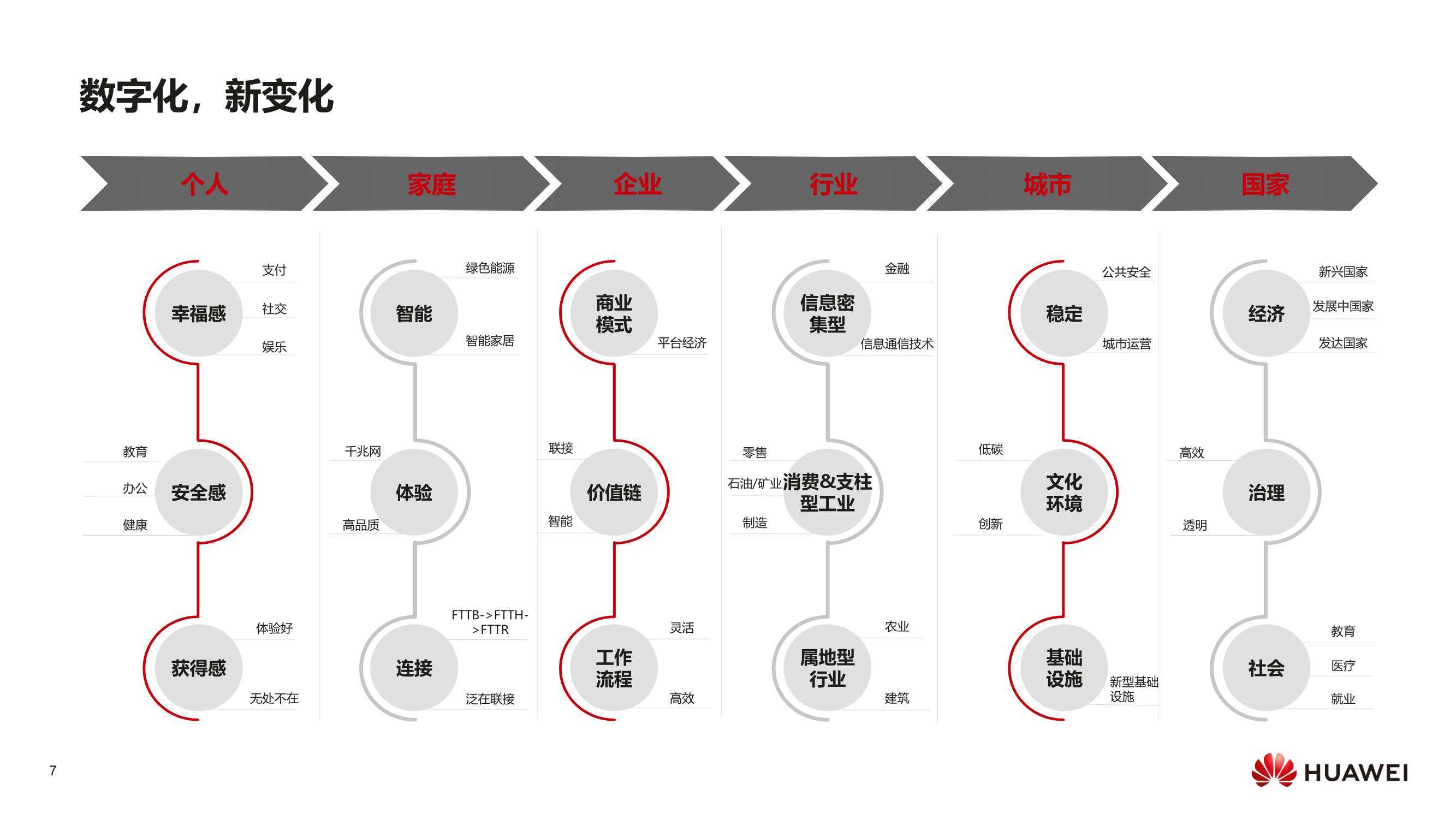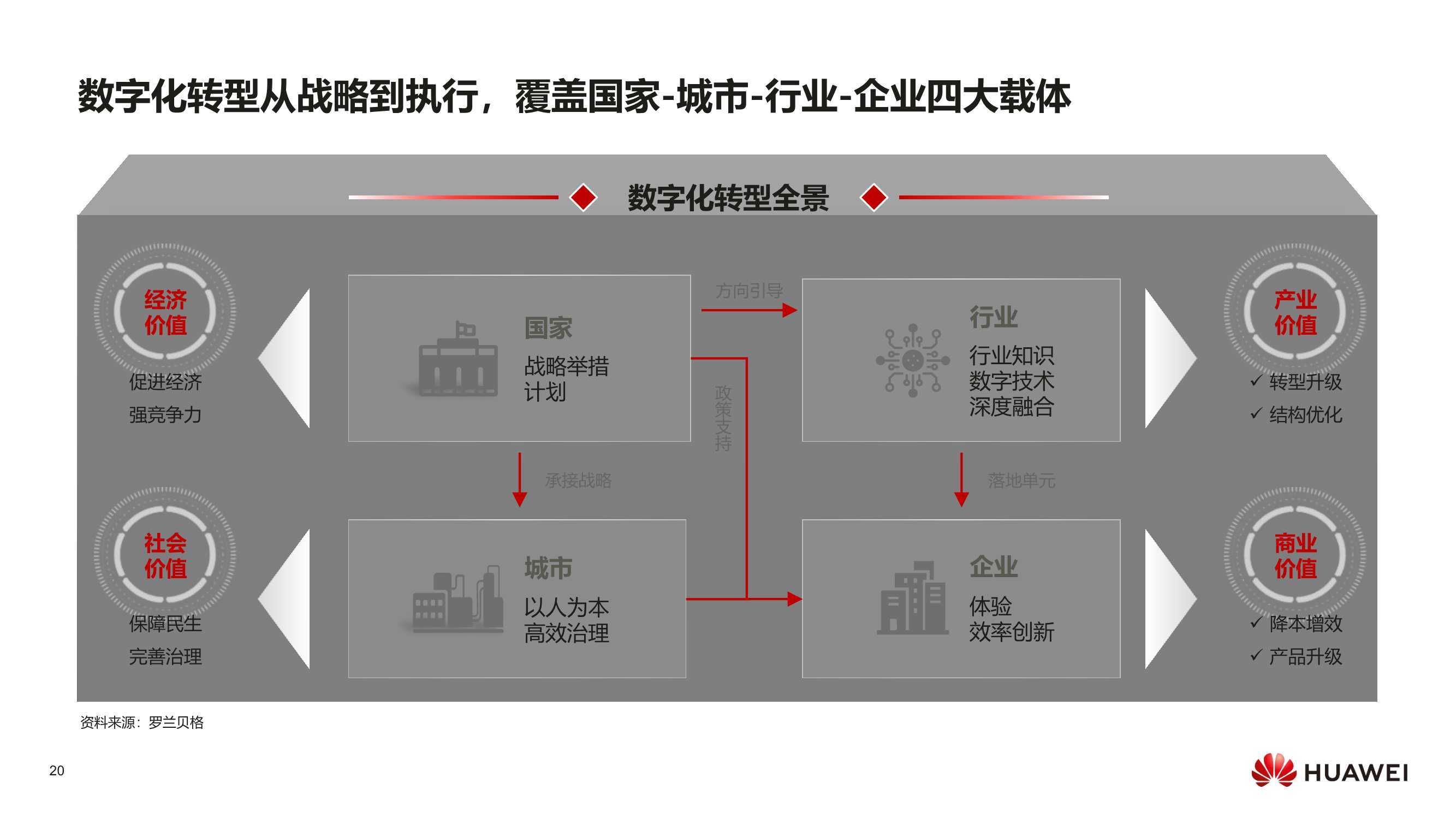 下面这份材料介绍了华为的数字化转型,从战略到执行,结合100多个国家的案例与数据,从6个角度(个人-家庭-企业-城市-行业-国家)、4个层次(国家-城市-行业-企业)、4个阶段(基础信息化-应用数字化-全面系统化-智慧生态化),系统解读数字化转型从战略到执行的全景框架,洞察实践,以及不同数字化转型阶段数字基础设施的部署重点及对数字经济的量化影响。