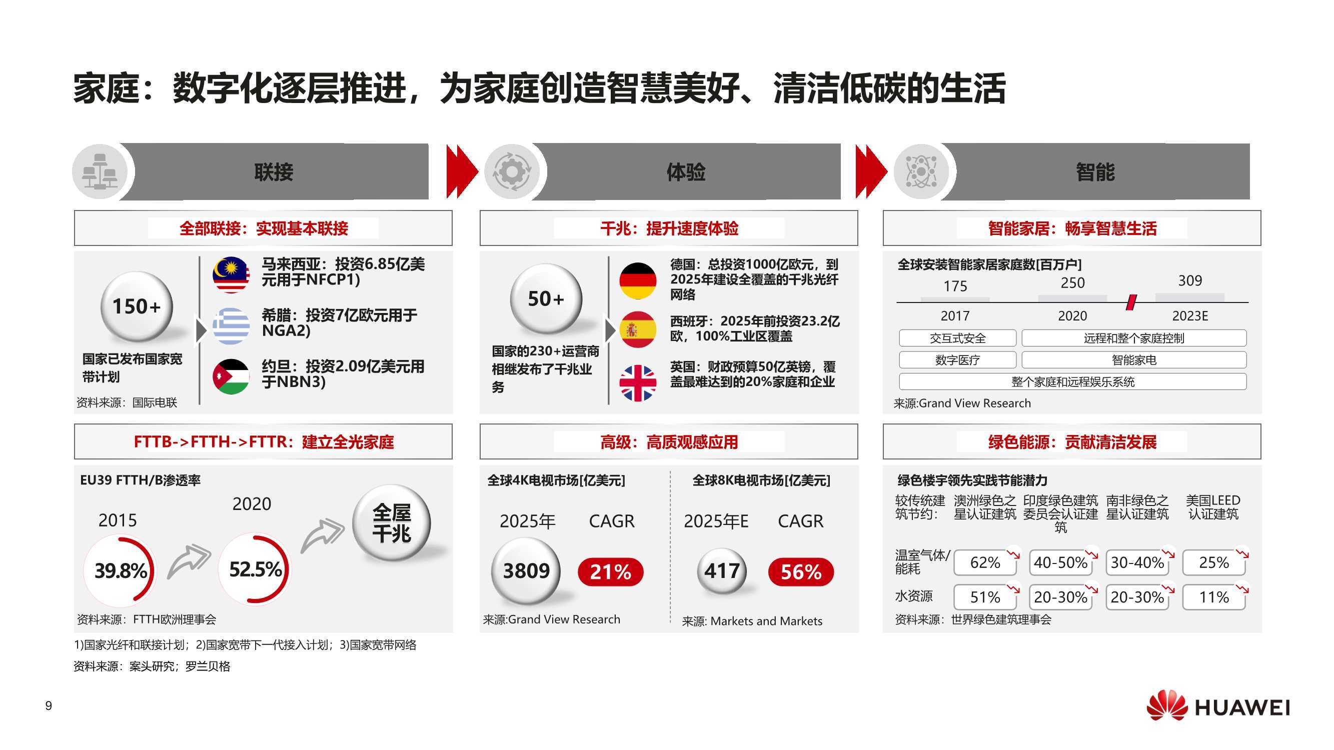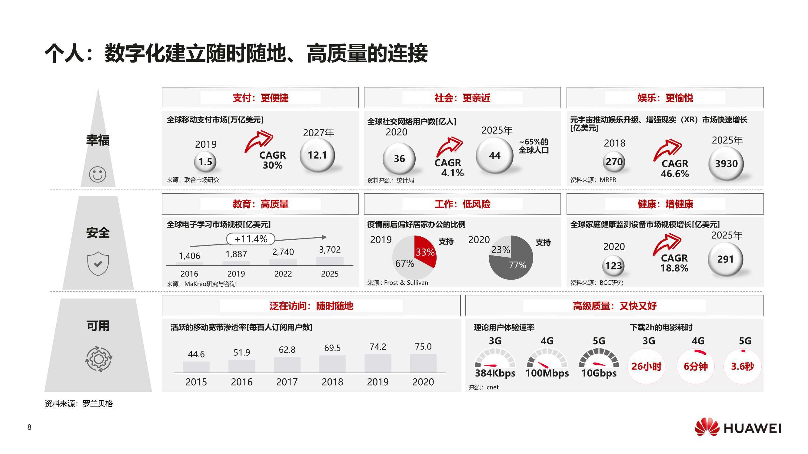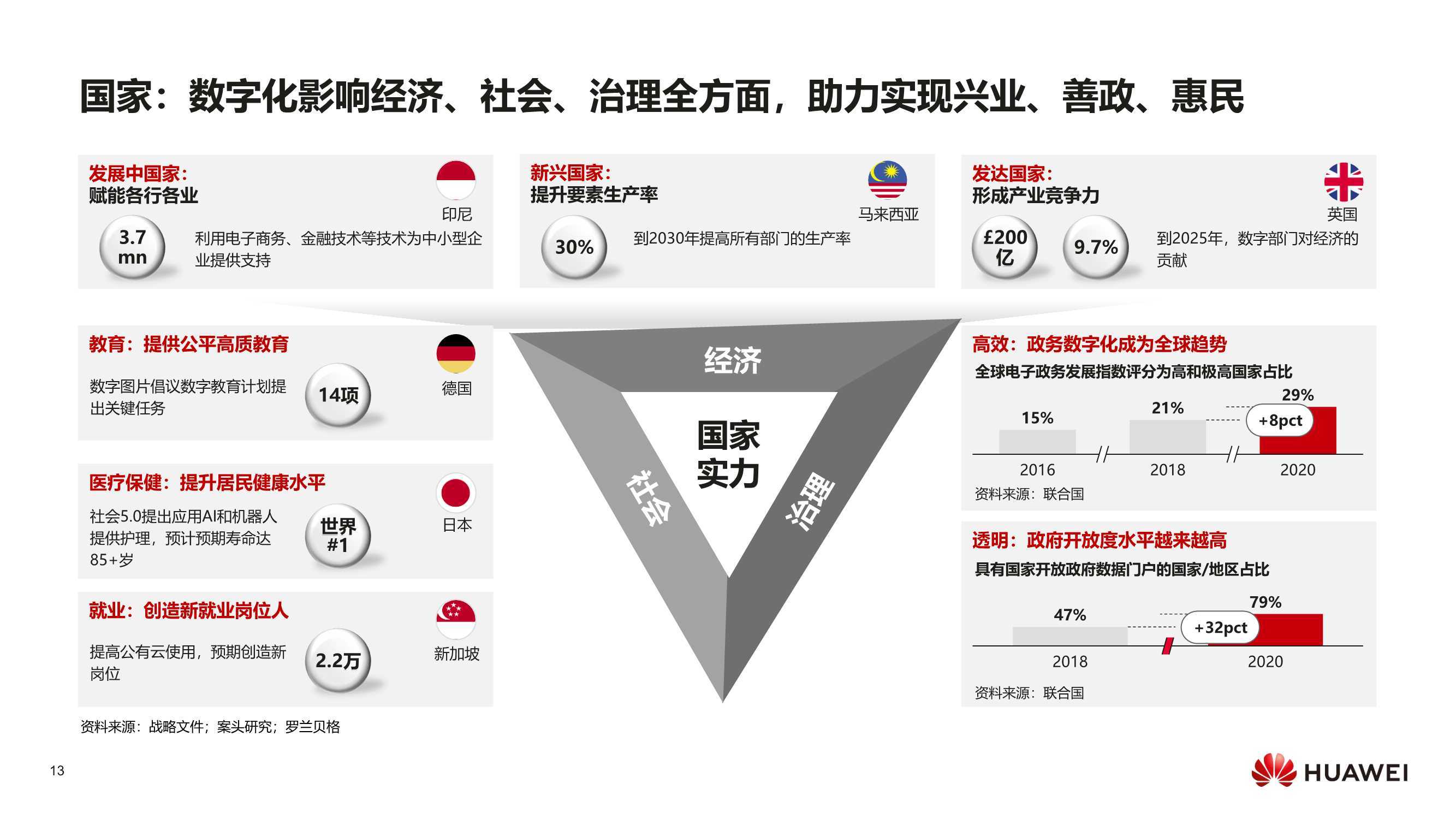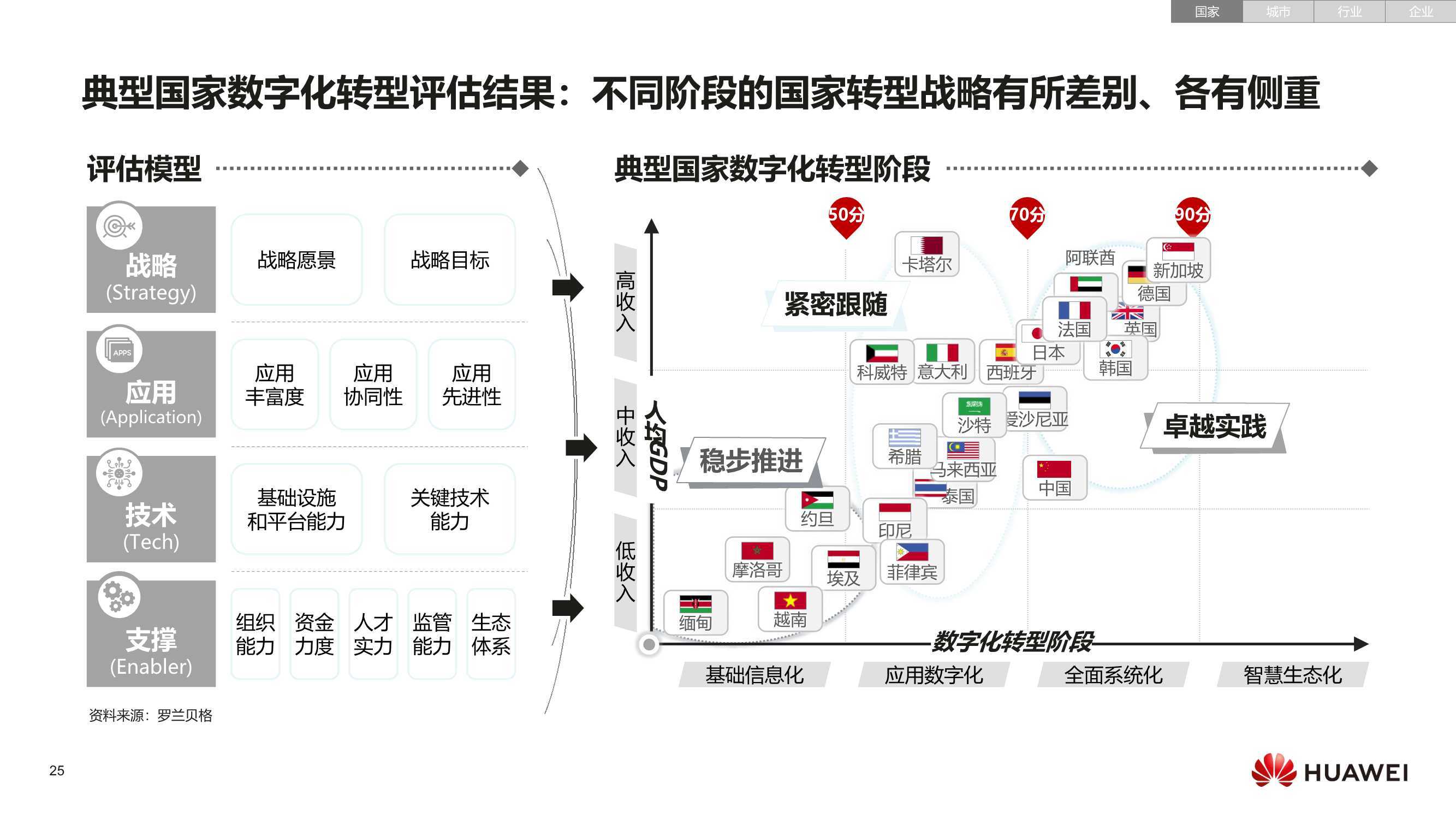 下面这份材料介绍了华为的数字化转型,从战略到执行,结合100多个国家的案例与数据,从6个角度(个人-家庭-企业-城市-行业-国家)、4个层次(国家-城市-行业-企业)、4个阶段(基础信息化-应用数字化-全面系统化-智慧生态化),系统解读数字化转型从战略到执行的全景框架,洞察实践,以及不同数字化转型阶段数字基础设施的部署重点及对数字经济的量化影响。