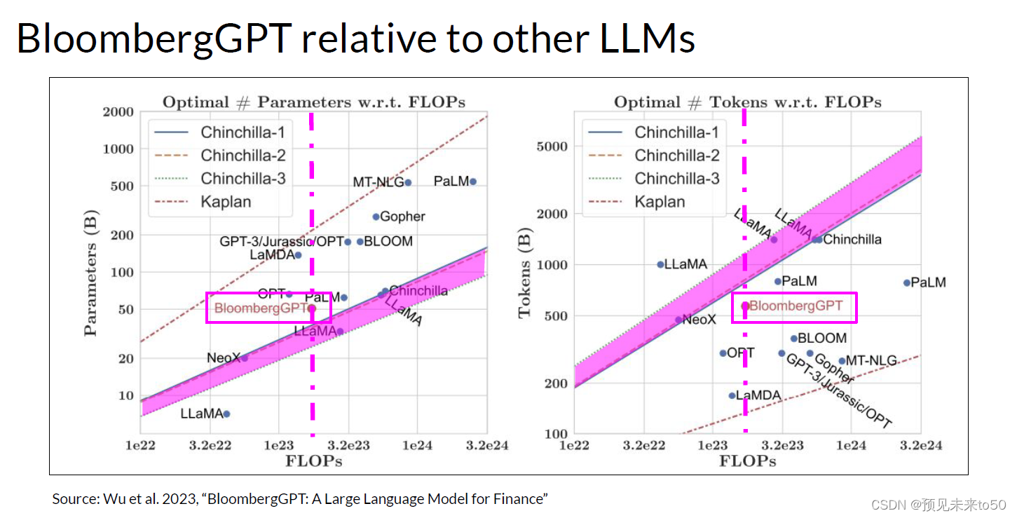 现在让我们回到BloombergGPT,它是由Shijie Wu、Steven Lu和Bloomberg的同事在2023年的一篇论文中首次宣布的。BloombergGPT是为特定领域预训练的大型语言模型的一个例子,在这个案例中,是金融领域。Bloomberg的研究人员选择结合金融数据和通用税务数据来预训练一个在金融基准测试上达到最佳结果的模型。同时在通用LLM基准测试上也保持竞争力。因此,研究人员选择了由51%的金融数据和49%的公共数据组成的数据。在他们的论文中,Bloomberg的研究人员更详细地描述了模型架构。他们还讨论了如何以chinchilla规模法则为指导开始,以及他们不得不做出权衡的地方。这两张图表比较了包括BloombergGPT在内的多个LLM与研究人员讨论过的规模法则。左边,对角线追踪了一系列计算预算下以十亿参数为单位的最优模型大小。右边,线条追踪了以令牌数量衡量的计算最优训练数据集大小。每张图上的粉红色虚线表示Bloomberg团队用于训练他们新模型的计算预算。粉红色阴影区域对应于Chinchilla论文中确定的计算最优规模损失。在模型大小方面,你可以看到BloombergGPT大致遵循了给定计算预算130万GPU小时或大约2.3亿petaflops的Chinchilla方法。该模型仅略高于粉红色阴影区域,表明参数数量接近最优。然而,用于预训练BloombergGPT的实际令牌数量5690亿低于Chinchilla推荐值,这是由于金融领域数据的有限可用性。这表明现实世界的限制可能会迫使你在预训练自己的模型时做出权衡。