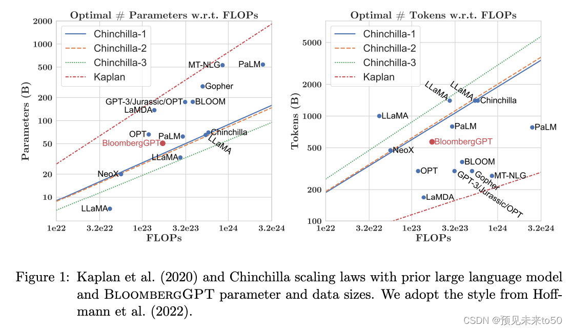 在BloombergGPT的训练过程中,作者们使用了Chinchilla规模定律来指导模型中的参数数量和训练数据的量(以tokens计)。Chinchilla的推荐配置在图中由Chinchilla-1、Chinchilla-2和Chinchilla-3线表示,我们可以看到BloombergGPT的配置接近这些推荐。