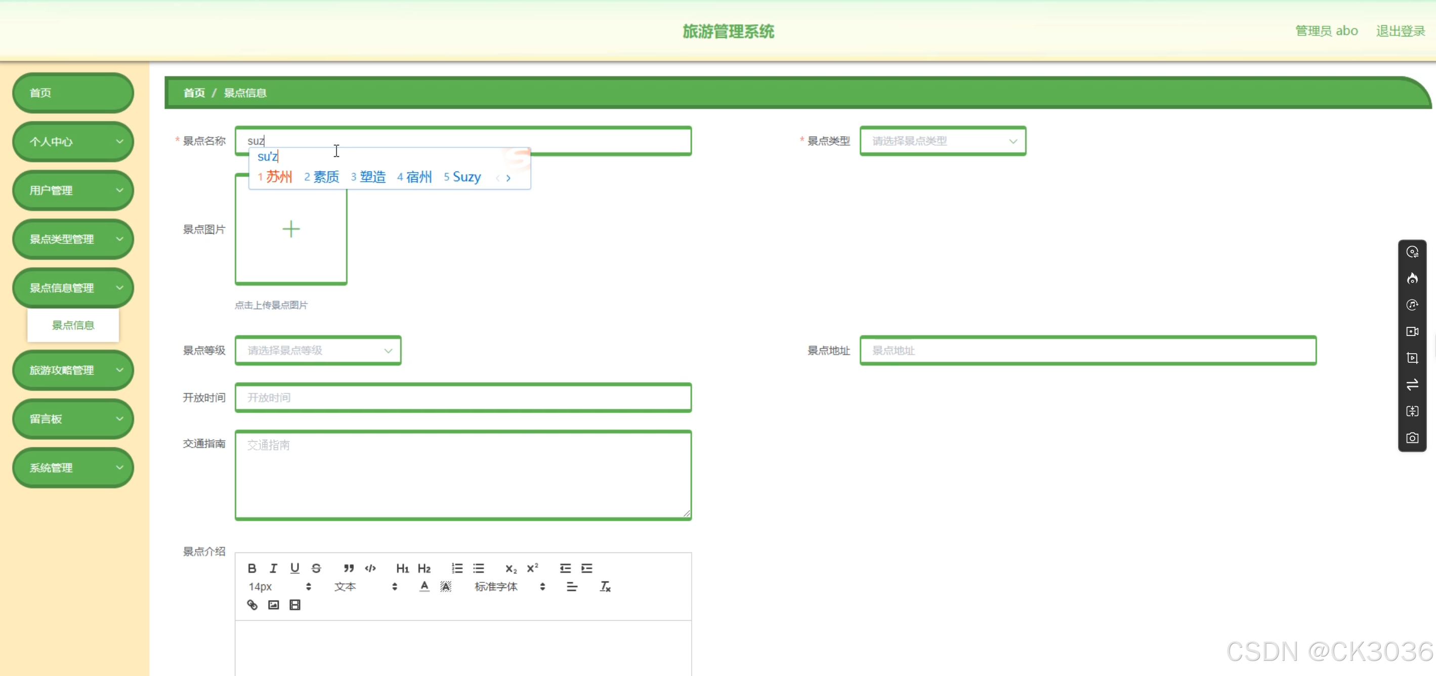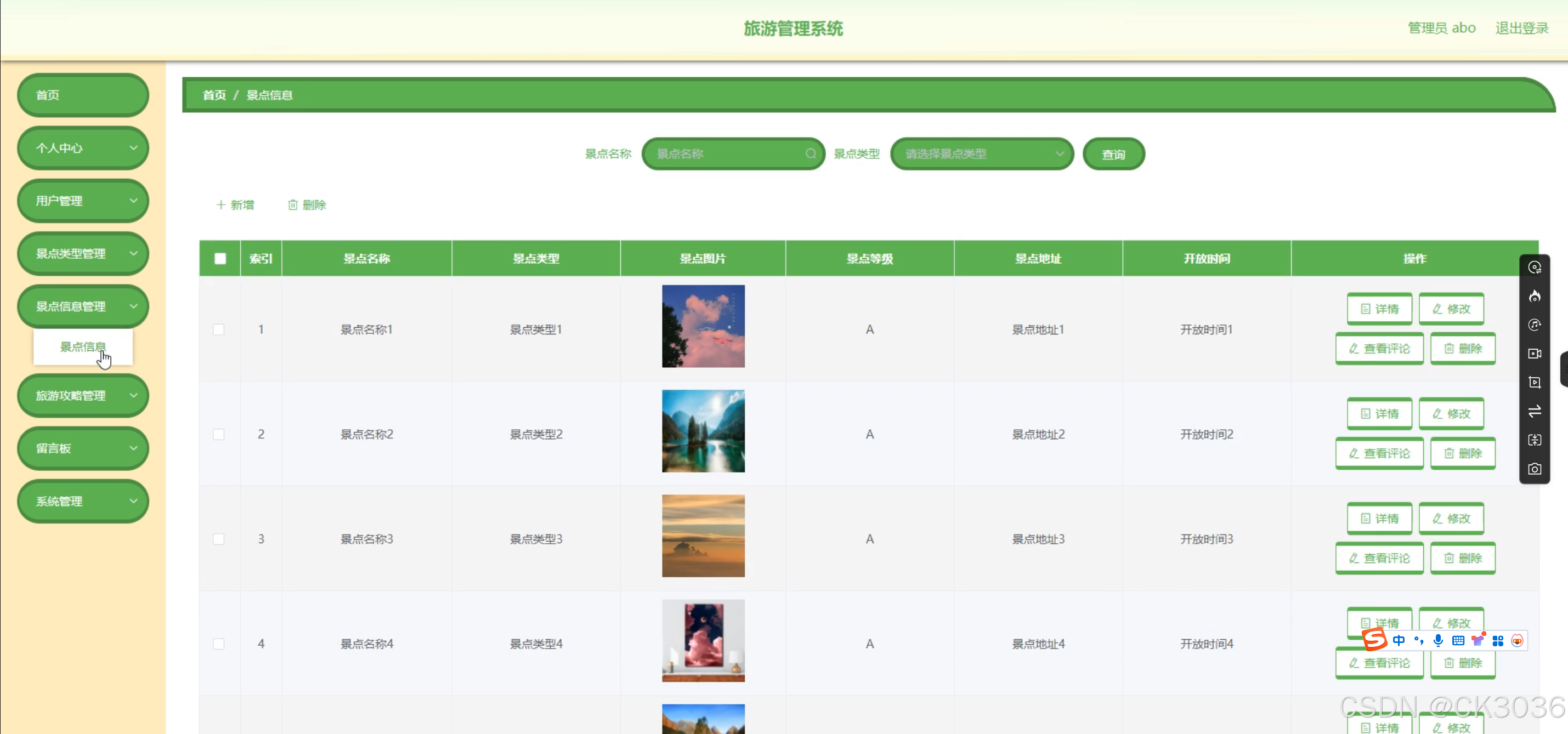 - 景点信息管理:分类展示景区内各类景点信息,包括图文介绍、开放时间、门票价格等,便于游客查询。