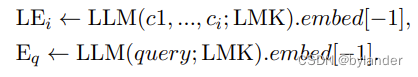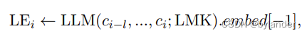 LEi的计算:c1到ci是滑动窗口中连续的句子,在句子后面增加一个特殊的token(LMK),从论文的描述看,应该是每个句子后面加一个LMK,然后通过LLM模型,embed[−1] 表示从大型语言模型(LLM)输出的嵌入向量中选择最后一个元素。