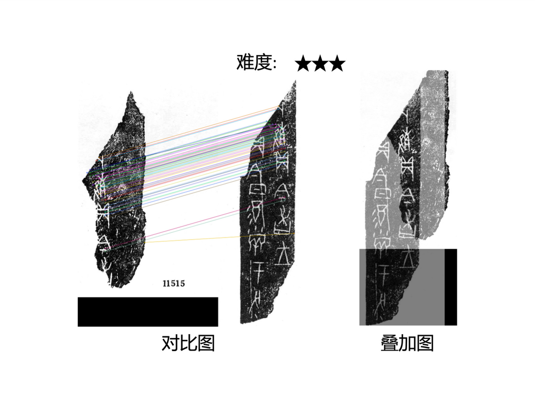 - “重而不同“的新图像。左侧是时间较早,没有拓全的甲骨拓本。右侧是时间较晚的拓本,甲骨残破只余下一部分,尽管拓全了但很不完整。通过将两个拓本重叠,获得了一张最完整的甲骨图像,特别是右上部分的一段甲骨文字的完整展现,为甲骨文研究直接提供了一条新材料。