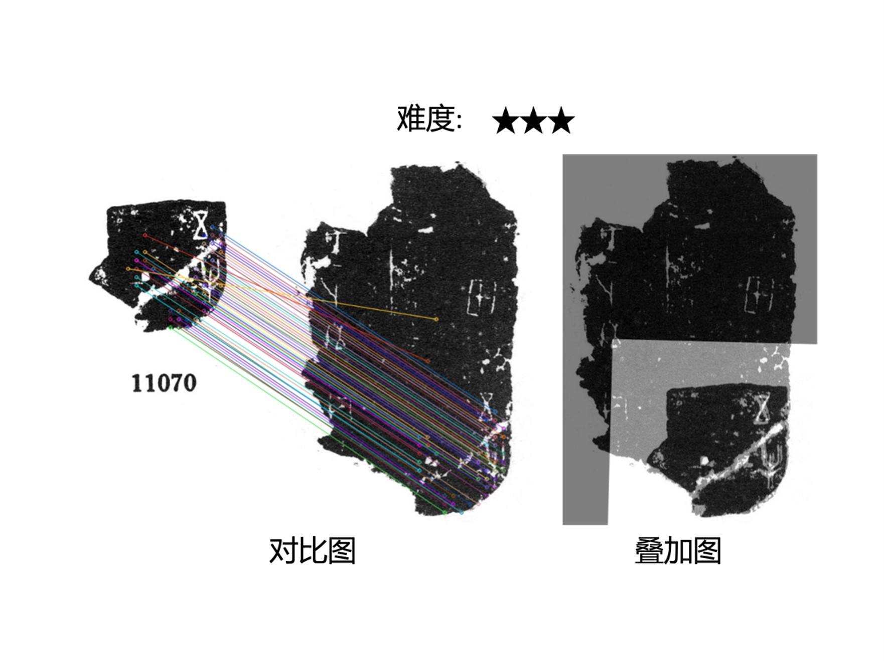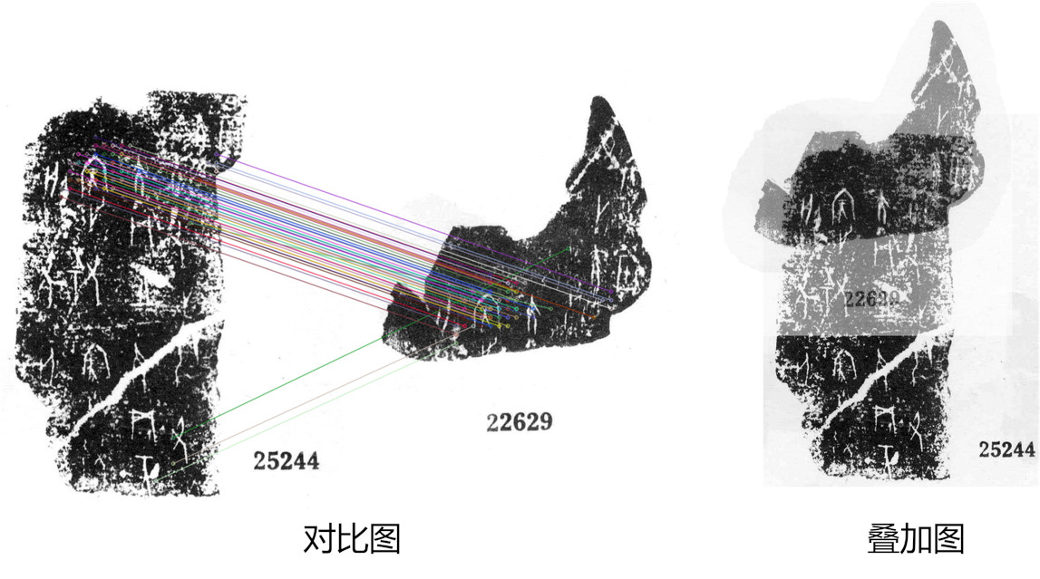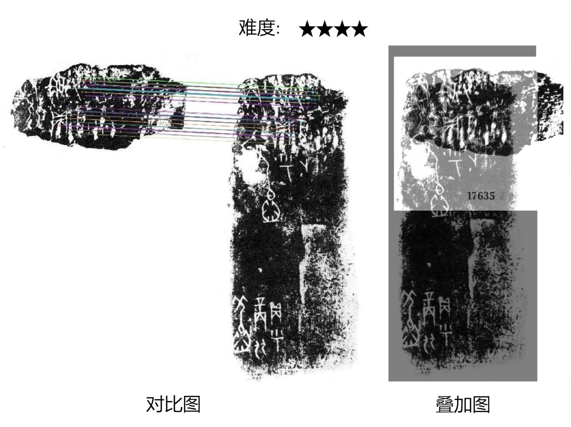 Diviner模型另一个特点在于能够精确的预测出重片之间点对点的对应关系,并将重片拼合或拼接在一起。这种可以被专家快速解读的结果大大方便了人类与人工智能的协同合作。对于甲骨文这样的冷门绝学,人机合作尤为重要。在校重结果中,专家可以看到局部匹配细节和重叠图,极大地帮助并加速了他们验证的过程。