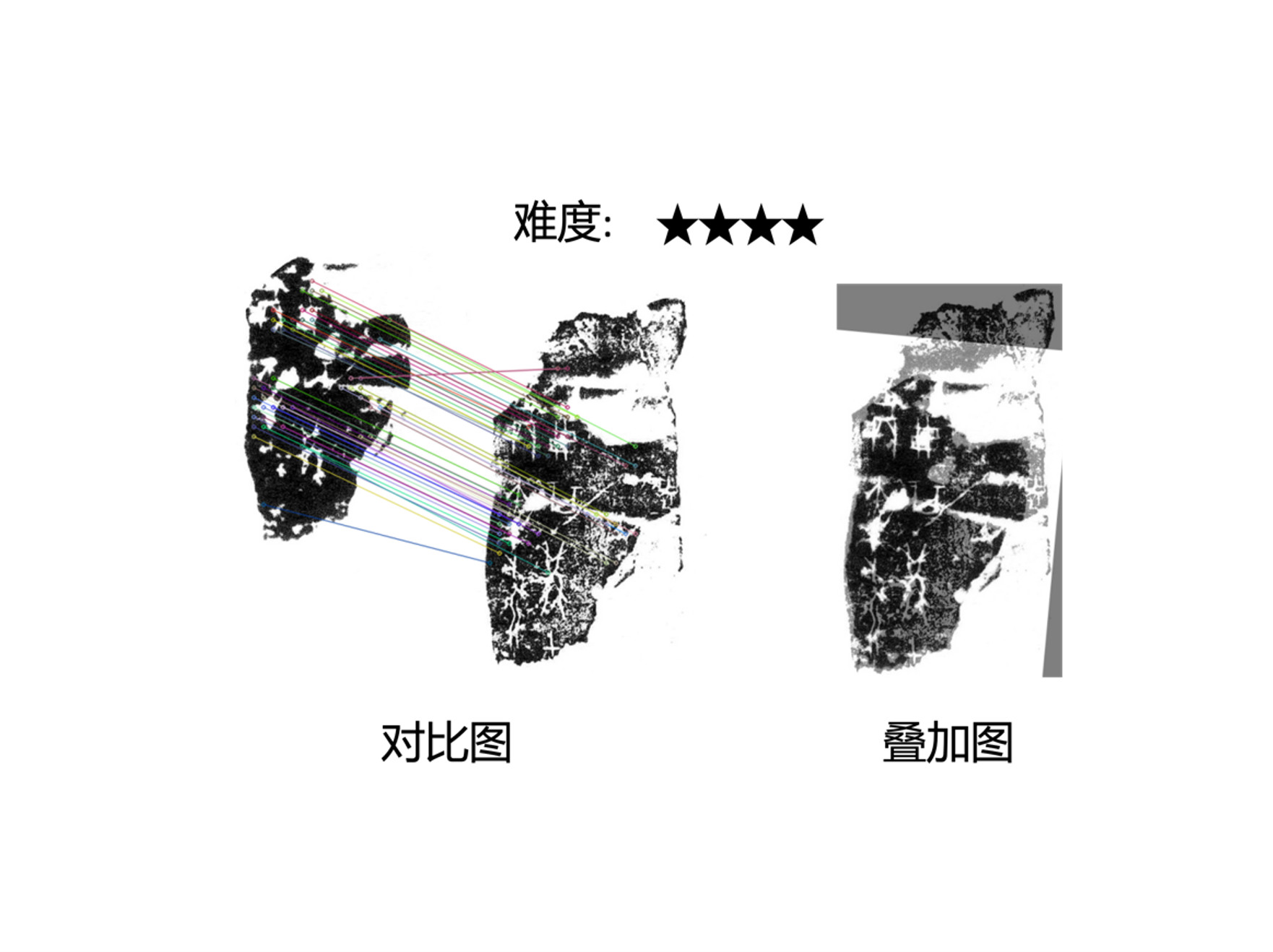 - 全局优化。基于密集的点与点的匹配结果,通过使用鲁棒的优化算法RANSAC估计全局的几何仿射变换。仿射变换允许模型在内容重复的情况下拼合或拼接已有图像。这种局部到全局的方法对检测大量的甲骨碎片至关重要。