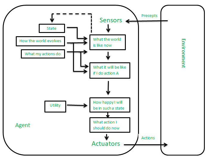 以其最终用途作为构建块而开发的代理称为基于实用程序的代理。当有多种可能的选择时,为了决定哪一个是最好的,使用基于效用的代理。他们根据每个状态的偏好(效用)选择行动。有时实现预期目标是不够的。我们可能会寻找更快、更安全、更便宜的旅程来到达目的地。应该考虑代理人的幸福感。效用描述了代理有多“快乐” 。由于世界的不确定性,效用主体选择最大化预期效用的行动。效用函数将状态映射到描述相关幸福程度的实数。