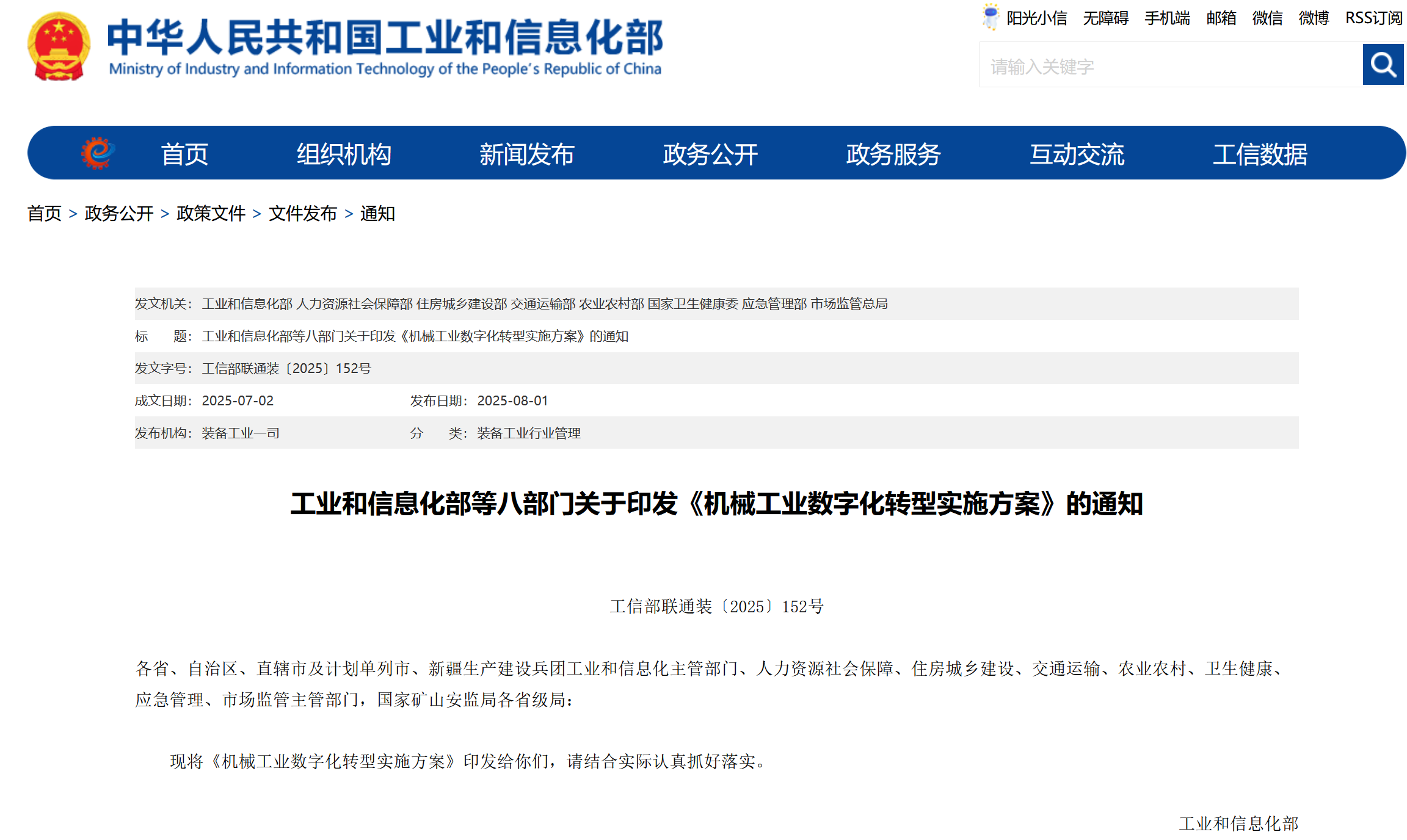 近日,工业和信息化部联合人力资源社会保障部、住房城乡建设部等八部门共同印发《机械工业数字化转型实施方案(2025—2030年)》,标志着我国机械工业全面迈向数字化、智能化发展的新阶段。这一政策的出台,不仅是对全球制造业数字化浪潮的积极回应,更是推动我国从“制造大国”向“制造强国”跃迁的关键一步。