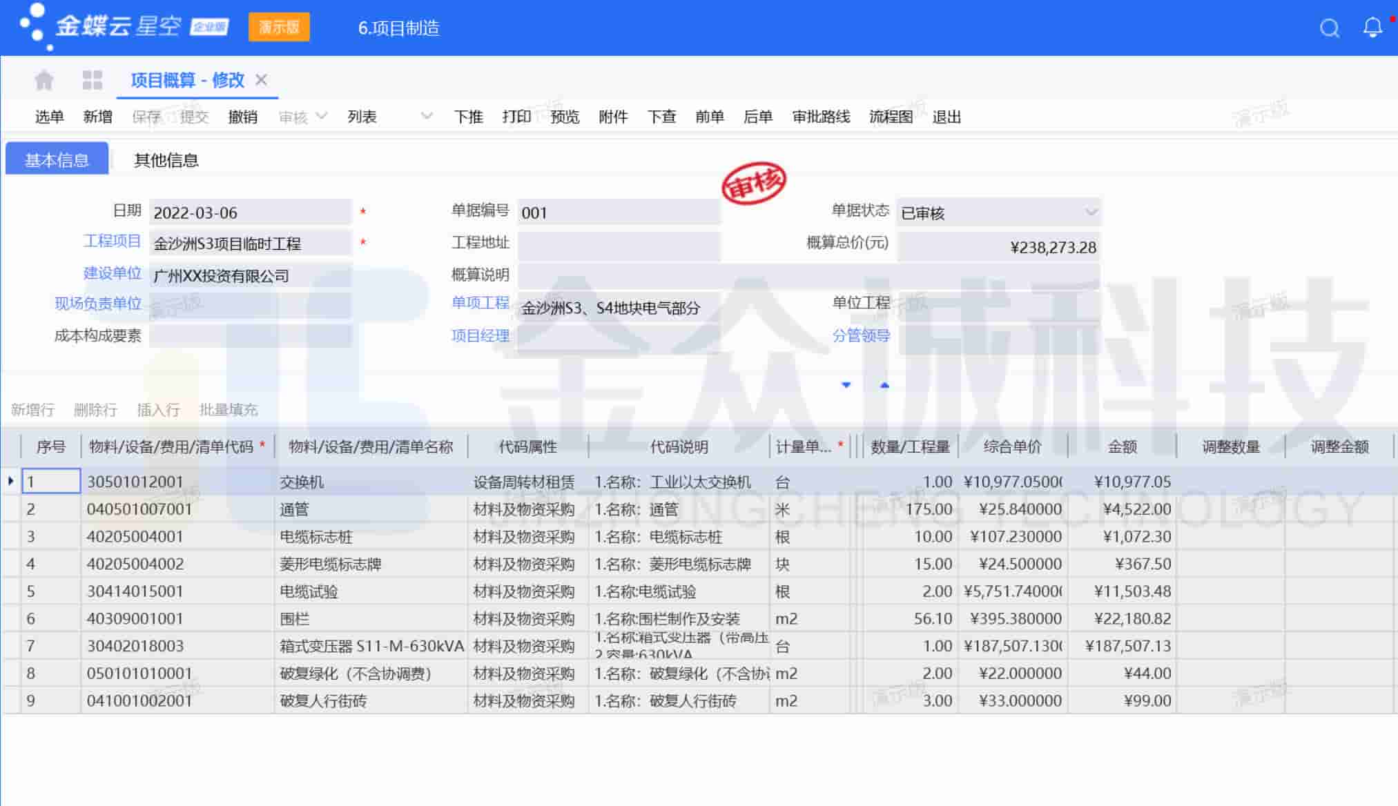 成本控制是项目管理的核心命题。金众诚系统创新性地引入“四算一控”机制——即概算、预算、核算、决算与成本动态控制,构建起覆盖项目全周期的成本管控闭环。