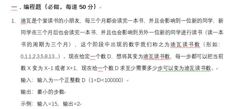 深思考人工智能机器人科技(北京)计算机视觉算法实习生机试-2020年10月果真是截止目前为止遇到的体验最好的一个公司的面试!下午两点前5分钟通知我2点机试,我当时还穿着睡衣呢,急忙出房间去换身衣服面试,没想到门锁上了,自己钥匙没带,去楼下招人开门才继续开始的面试。小姐姐人很好,发给了我4道题。第一道题:我的思路:思路:创建迪瓦读书数,此数列的规律是后一个数是前两个数的和,最后找这个数列中与输入的D