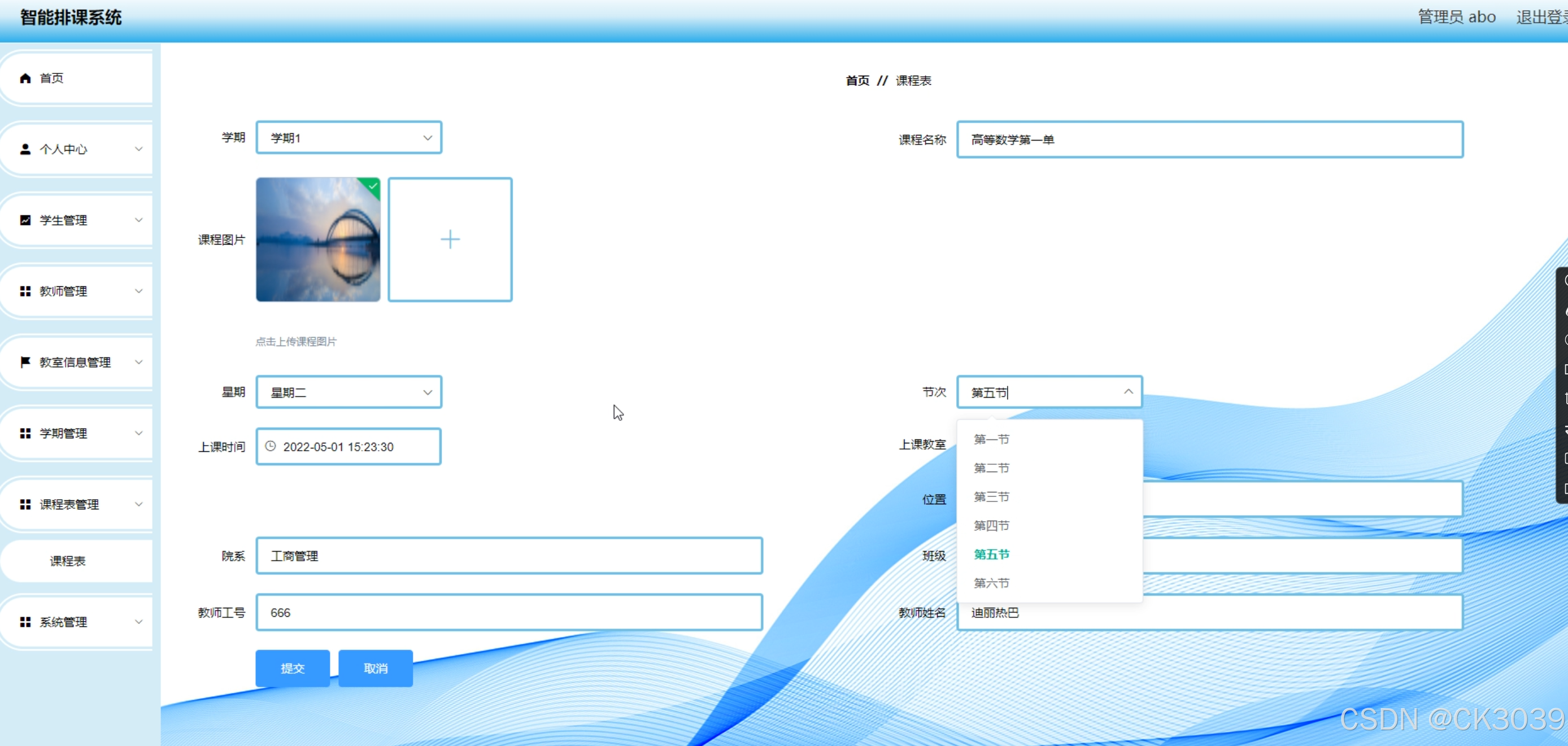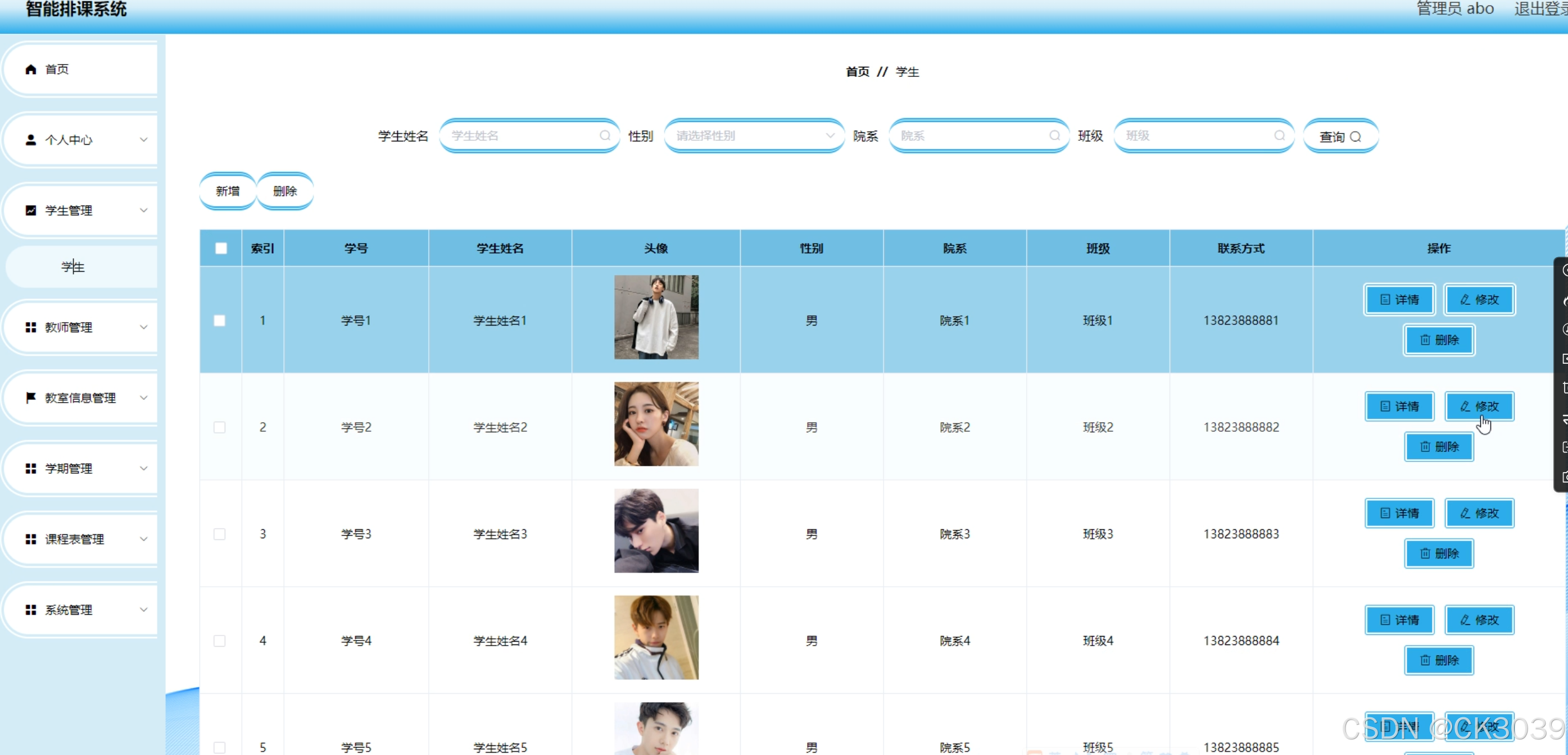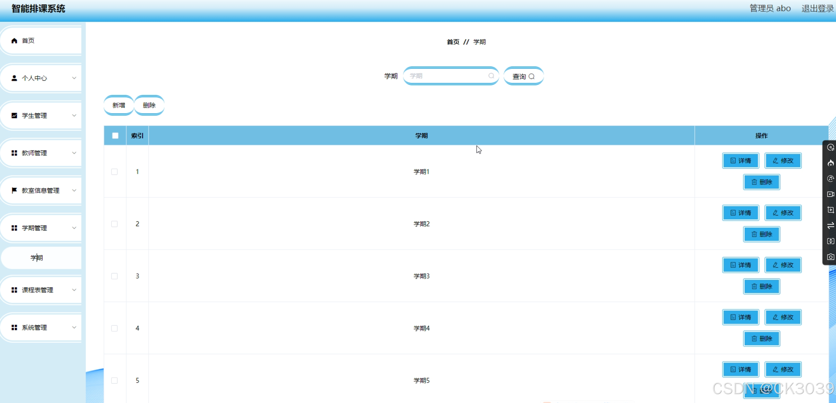 - 学期信息管理:包括学期开始时间、结束时间、假期安排等,以便系统能够根据学期的时间表进行排课安排。