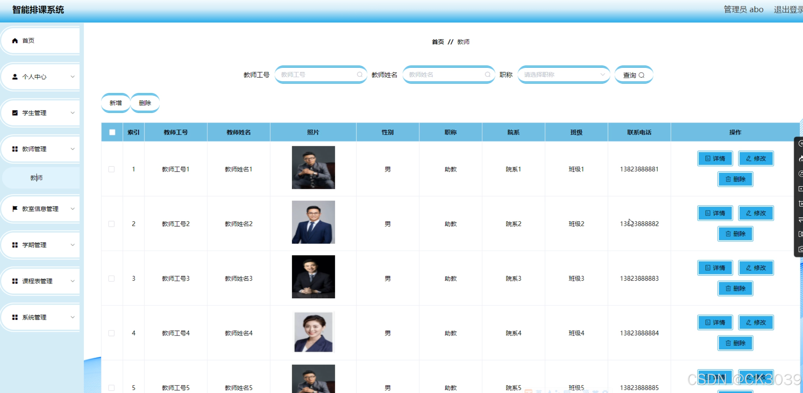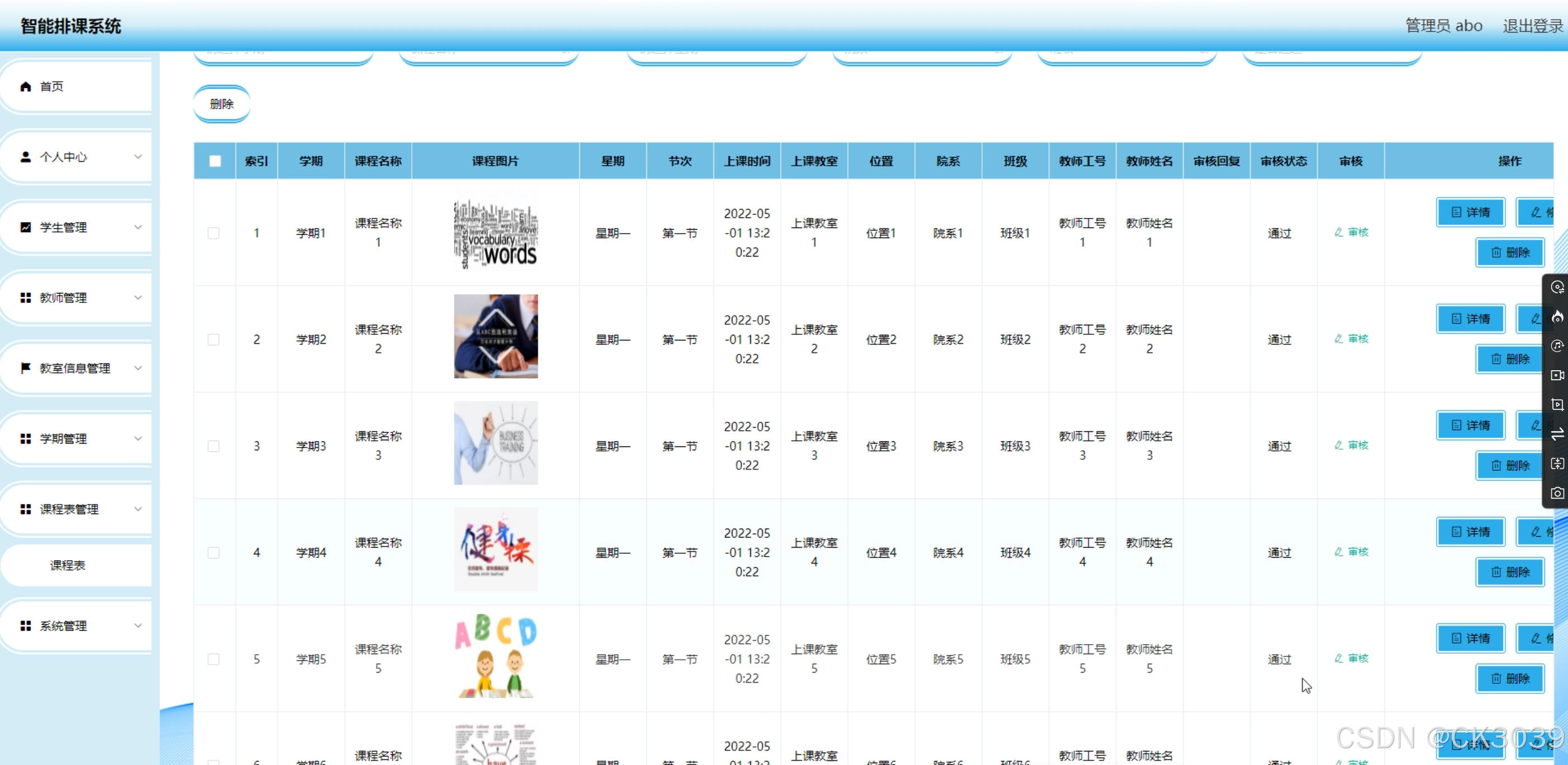 - 课程信息管理:包括课程名称、课程编号、学分、上课时间、上课地点等,以便系统能够根据课程的要求进行排课安排。