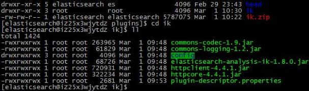 修改好后,打成zip包上传至Linux系统elasticsearch-2.2.0/plugins目录下,使用unzip ik.zip解压