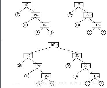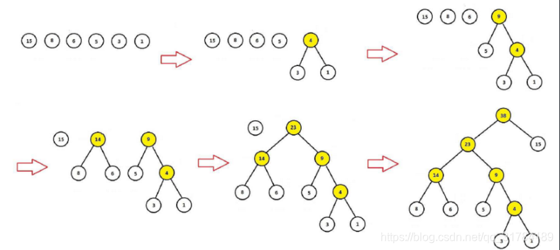 在森林中选择两个根节点权值最小的树进行合并,作为一颗新树的左右子树,新树的根节点权值为左右子树的和