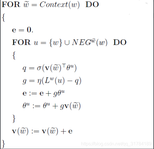 其中内部大括号部分为w相关参数的梯度计算过程,e为w的梯度和学习率的乘积,具体参考:word2vec 中的数学原理详解(五)基于 Negative Sampling 的模型_peghoty-CSDN博客_negative sampling