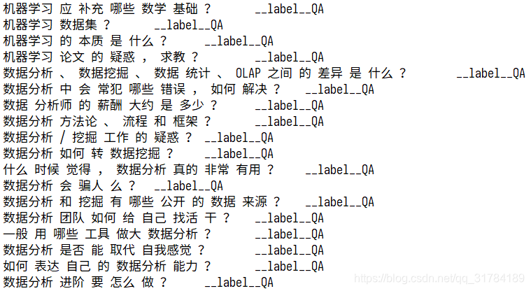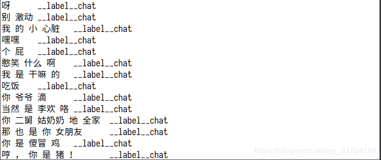 以上格式是fastText要求的格式,其中chat、QA字段可以自定义,就是目标值,__label__之前的为特征值,需要使用\t进行分隔,特征值需要进行分词,__label__后面的是目标值